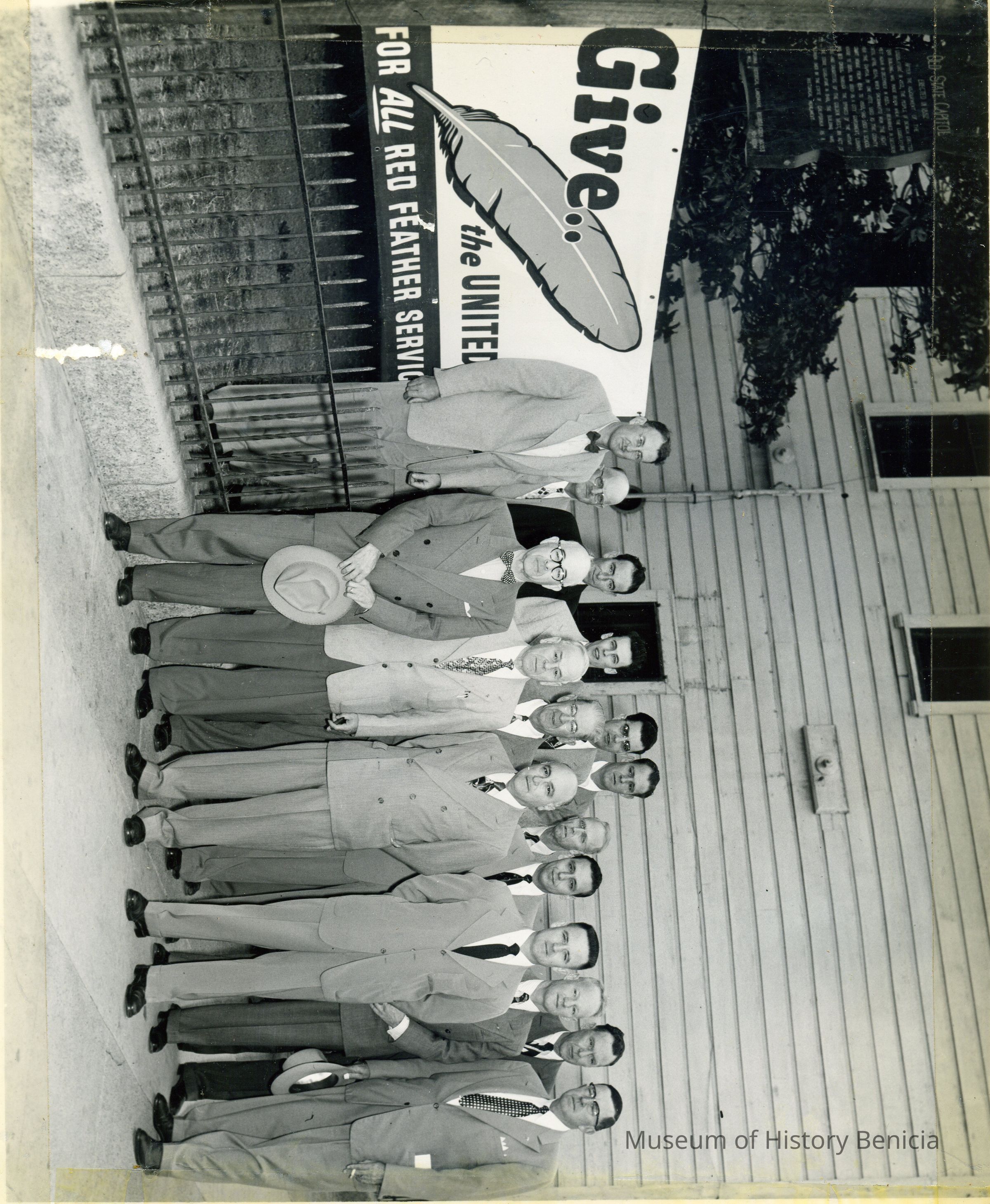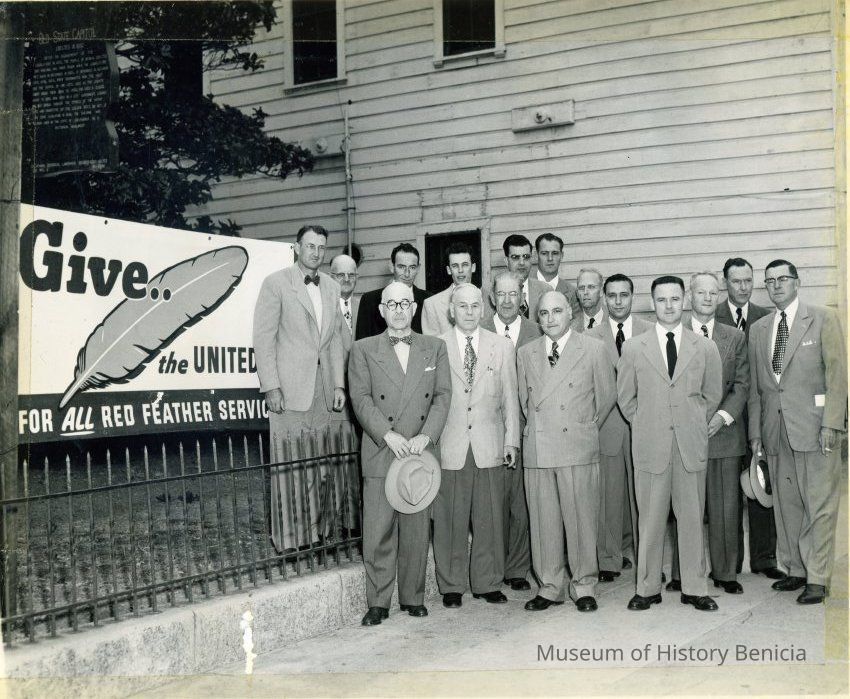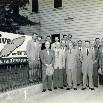 Photo of a group of men in front of a sign for "the United ?" Assume this is a sign for the United Way.