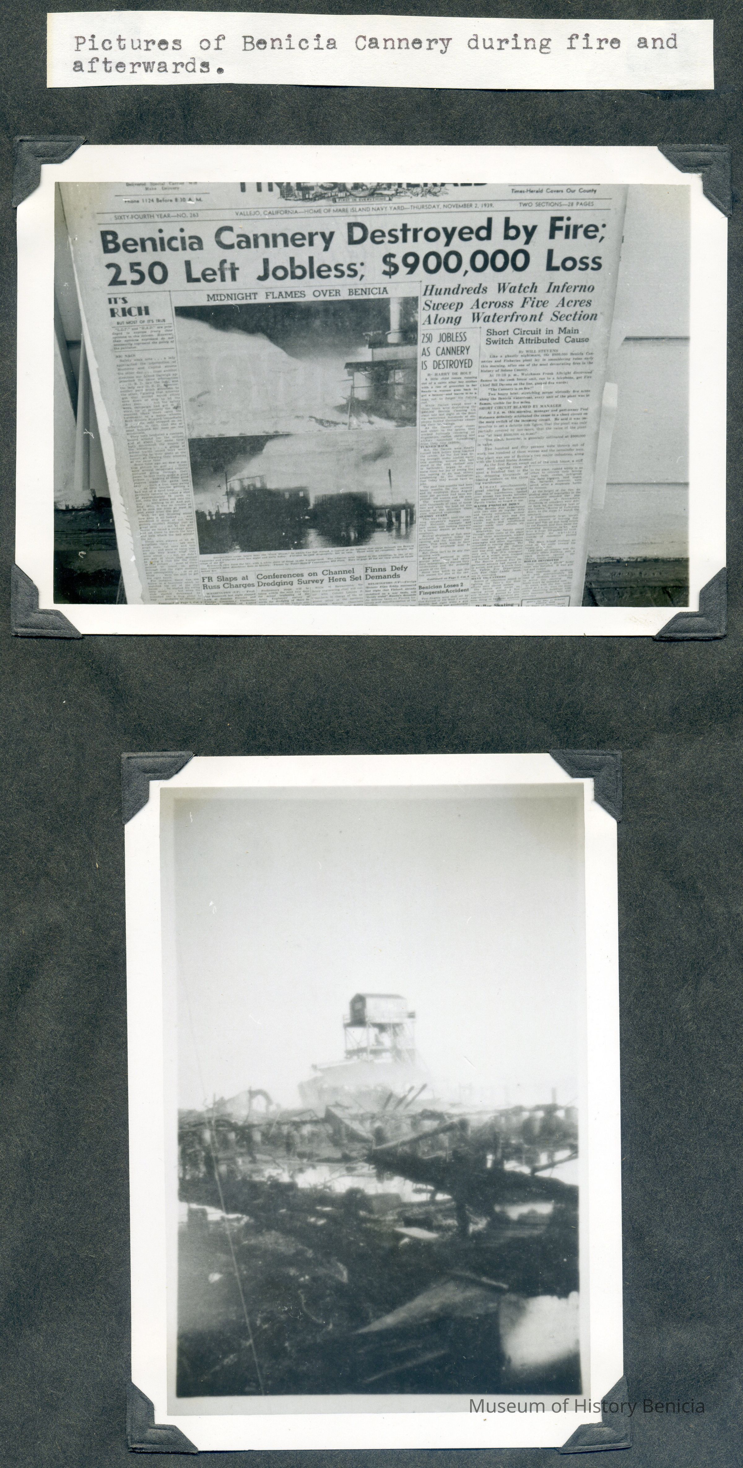 B/W photographs of Benicia Cannery during fire and afterwards.Collection