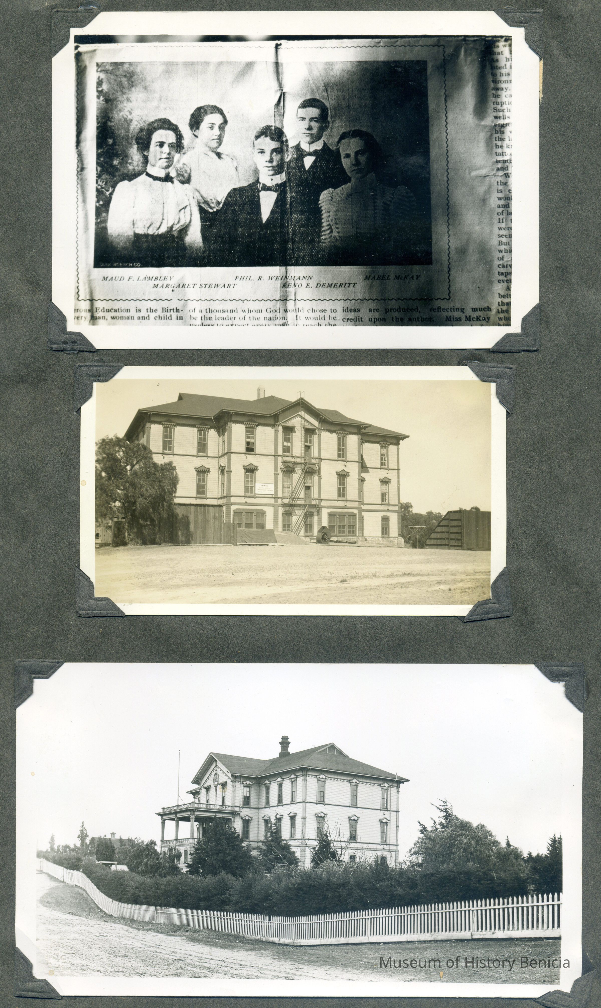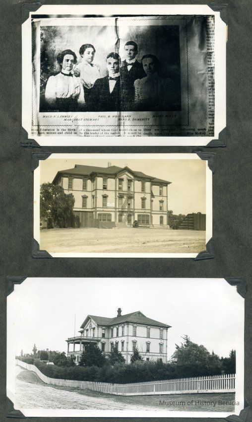 B/W photographs of the first Benicia High School gradating class and two photos of the old "grammar/high school".Collection
