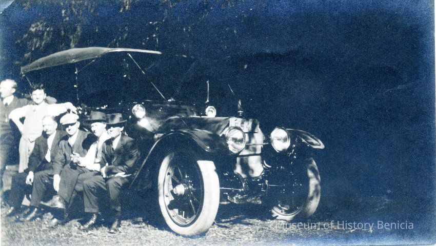 Photo of a group of men outside partying. The photos came in an envelope that says "Stag Party at Tucker's". The only reference to Tuckers I could find was to a resort near Mt Tamalpias in the early 1900s. It could be that this group of Benician's made a road trip to Mt Tamalpias as a getaway. The museum has the original negatives from this trip. They are assumed to be by John Molfino.