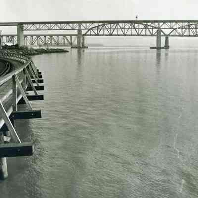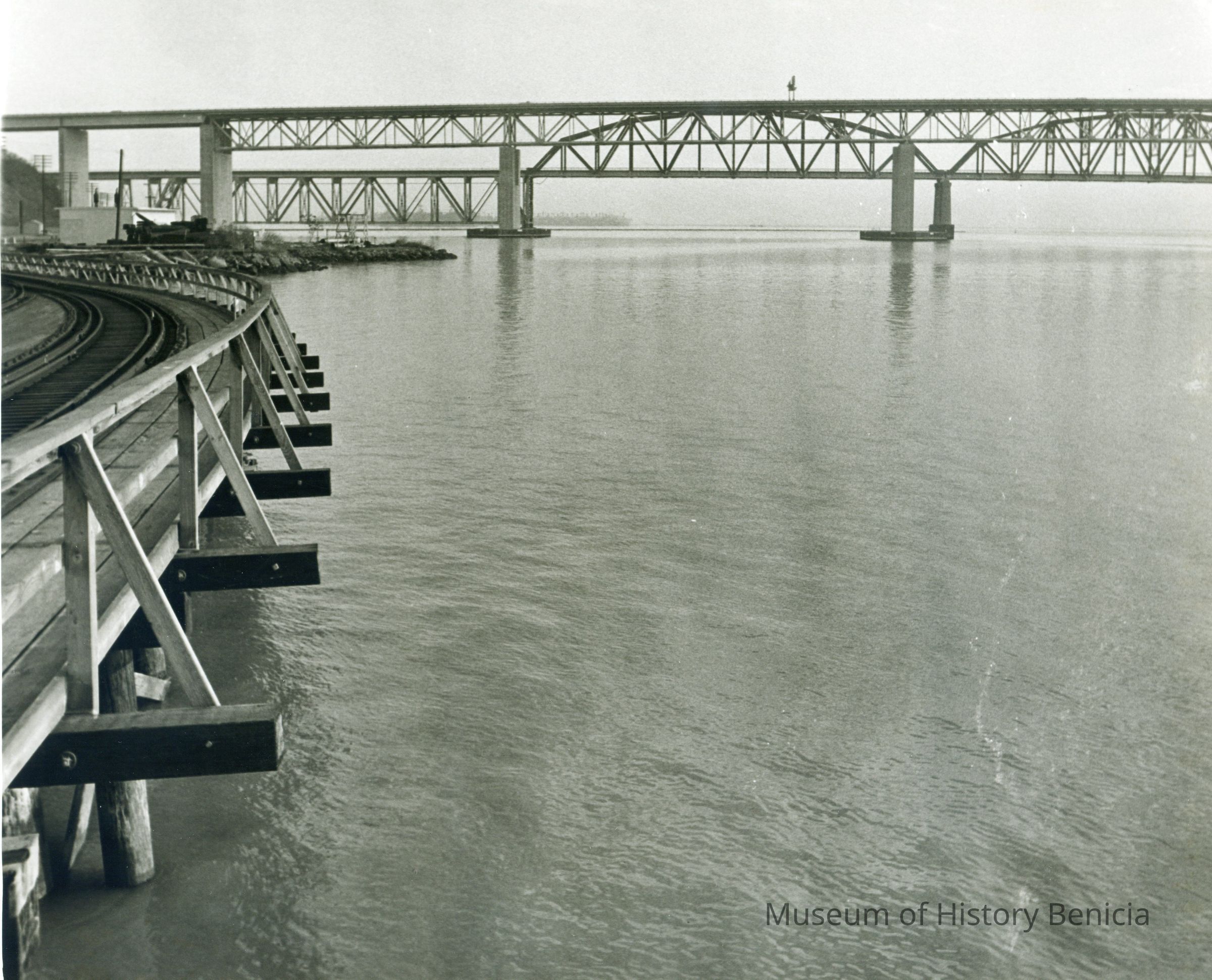 B/W photo Carquinez Strait shoreline south of SP Railroad and Benicia/Martinez bridges; railroad tracks on wooden pier at left, water at right.
