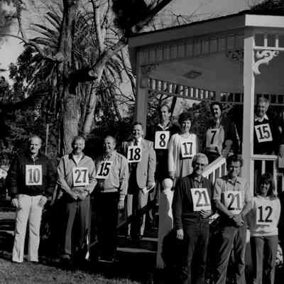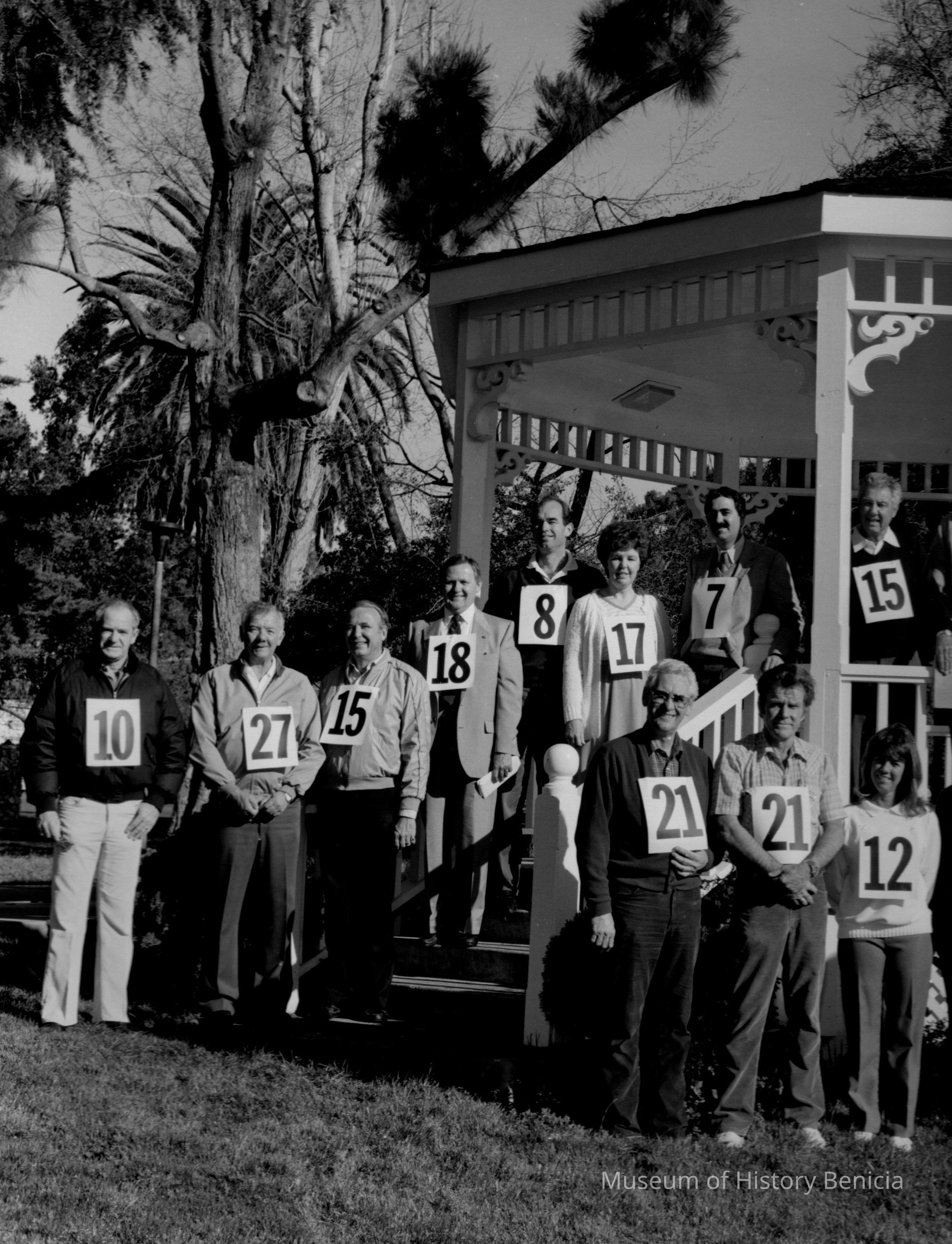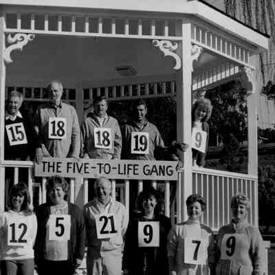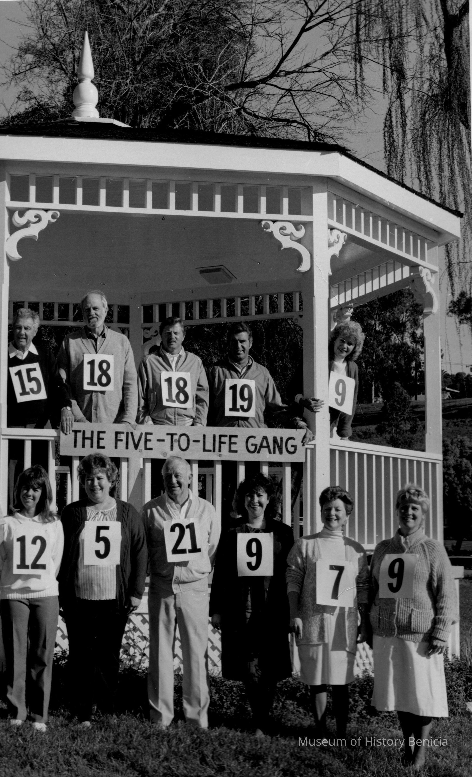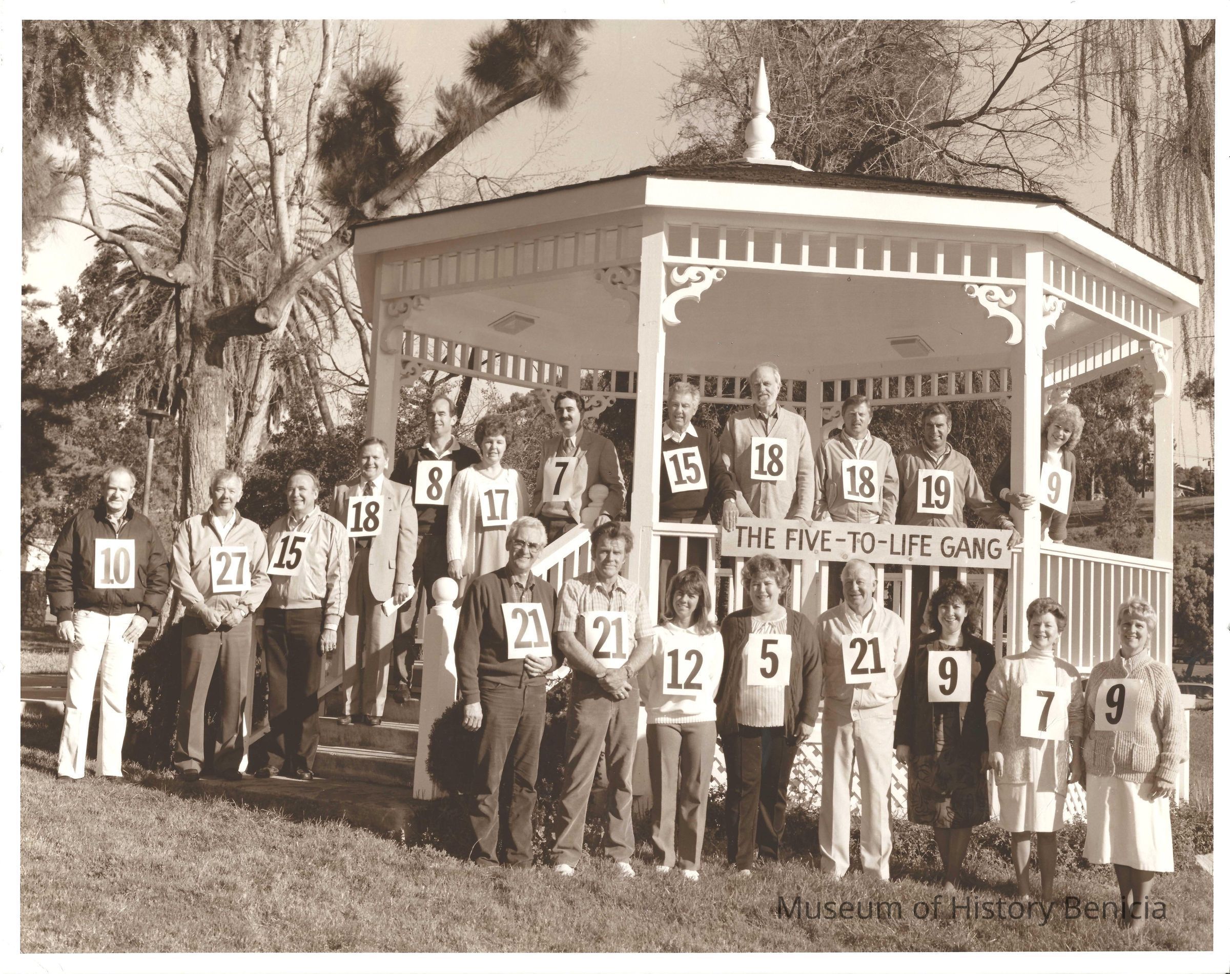Sepia-tone photo of twenty people at the gazebo in Benicia City Park. Each wears a sign with a number, and a sign on the gazebo identifies these people at the "Five-to-Life Gang". Ray Shehan at far left.