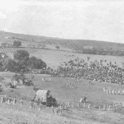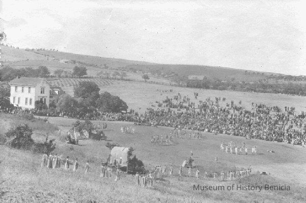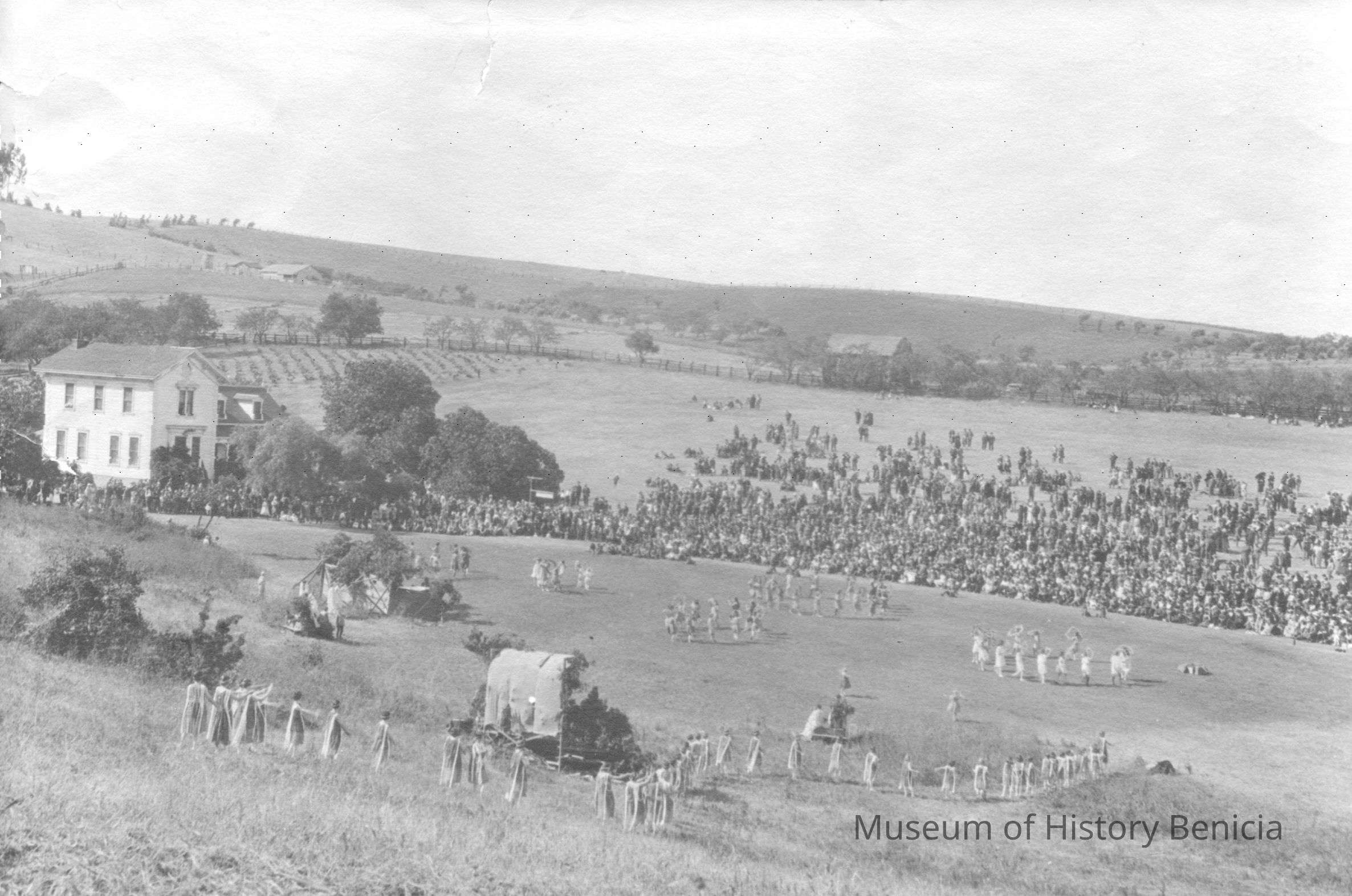 B/W view over hills, house at left, scattered farm structures. Circles and lines of dancing women and children in foreground; crowd in midground. "May Day 1905 Benicia" in green ink on back, crossed out, and "Pometta Ranch 1923" in black ink.Collection