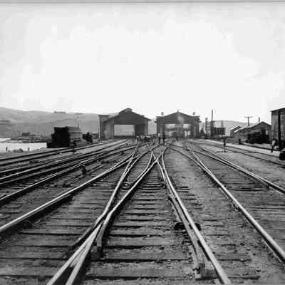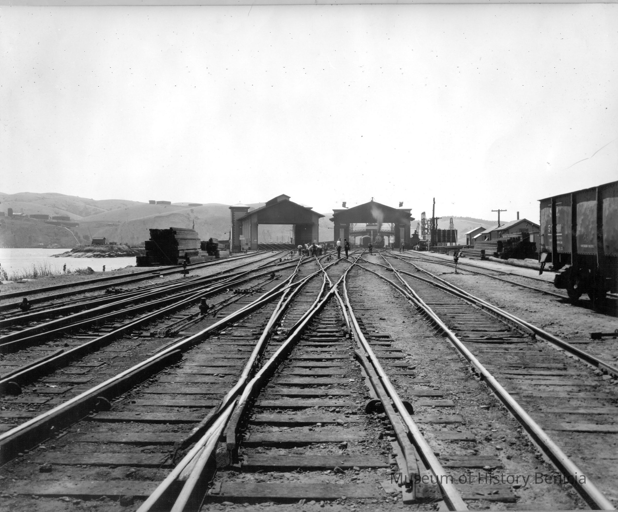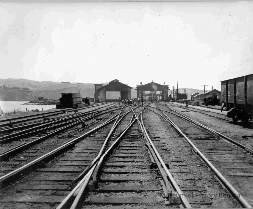 B/W Photograph: Benicia yard view, looking west, about 1923. (information on the back of the photo is incorrect in saying it is looking "east", because the straits are on the left, not on the right as they are when you are looking east.)Collection