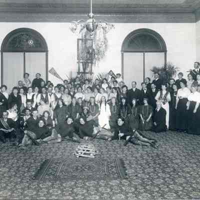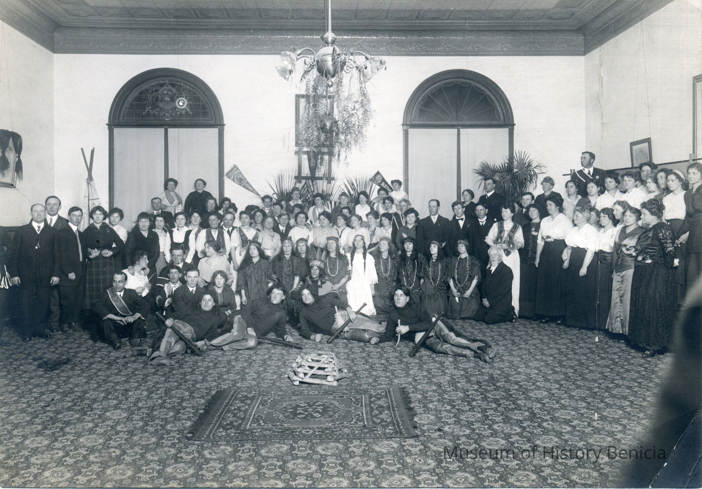 A group of people (possibly belonging to different groups or chapters of the same group because of their dress) in an ornately carpeted room. The groups are the Redmen and Pocahontas.Collection