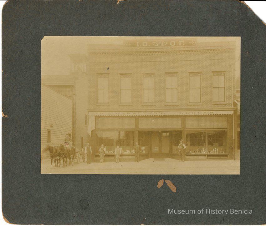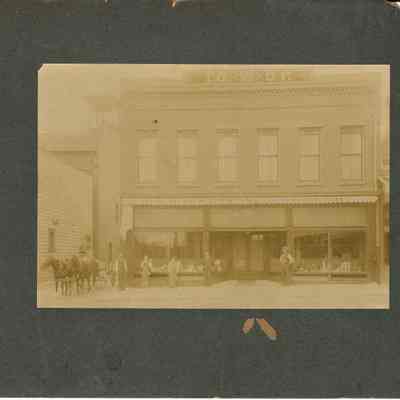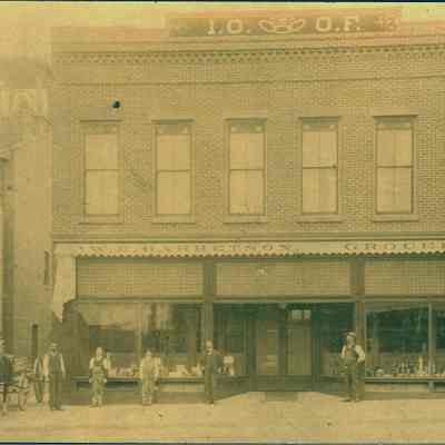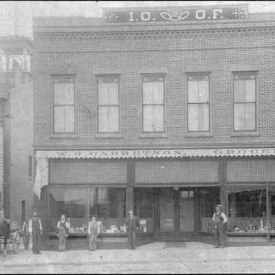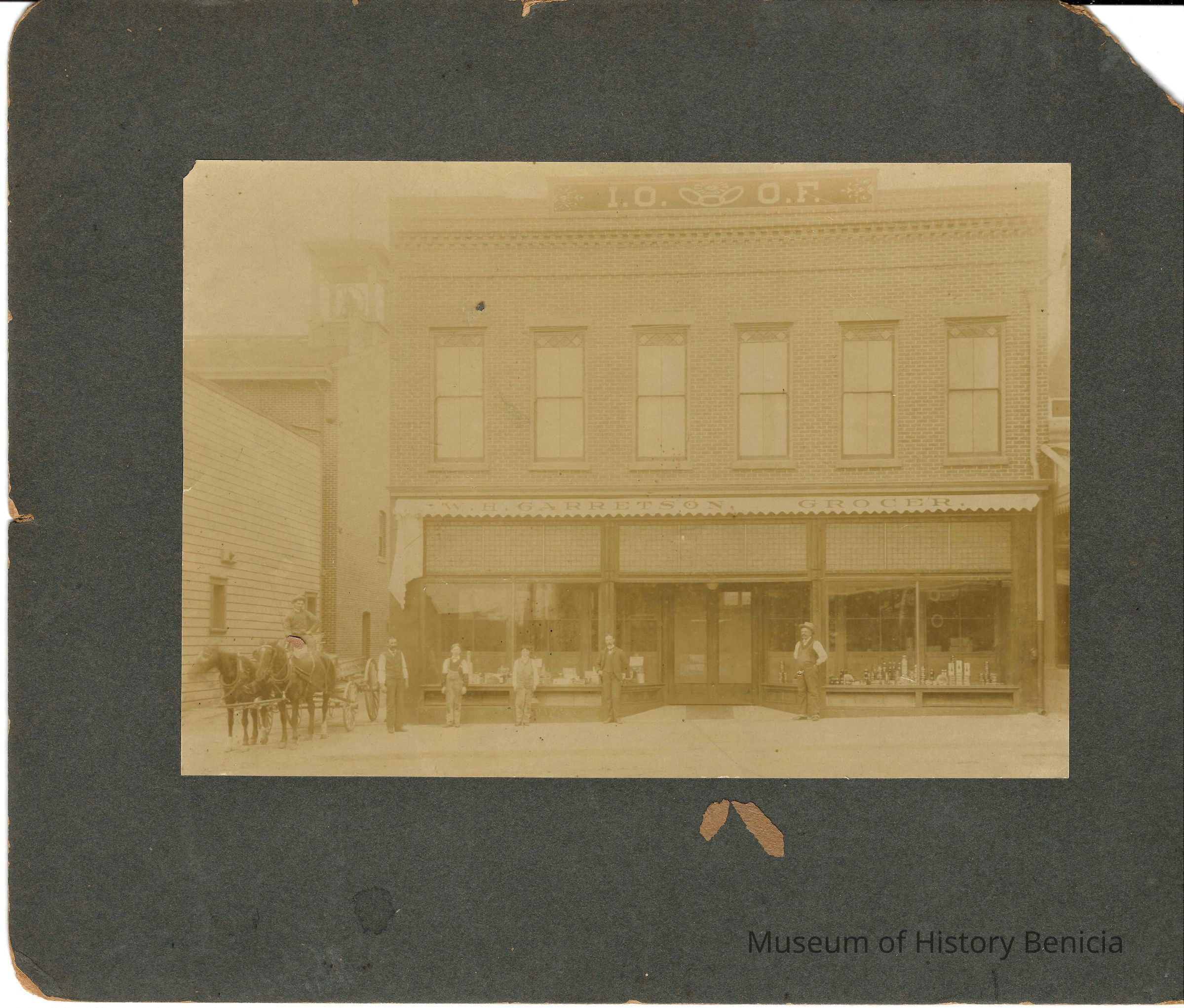 Photo on cardboard of the IOOF Hall. Several men standing outside and a horse drawn wagon. Sign on bottom of building says "W H Garetson Grocer". On the back is written the name Florence White.Collection