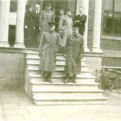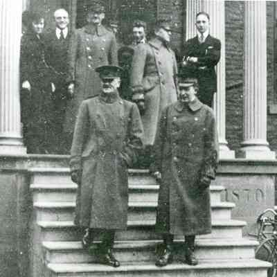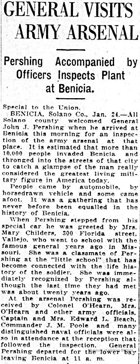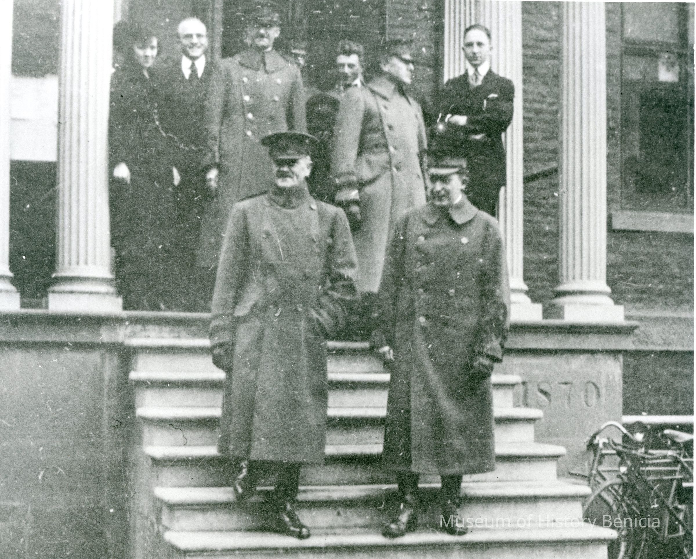 General Pershing and staff visitor. Benicia Arsenal - Jan 24, 1920 - The general and party on steps of Arsenal headquarters. (This is the old headquarters building, number 47, built in 1870) General Pershing on left, Colonel O'Hern on right on steps. B/W photo.