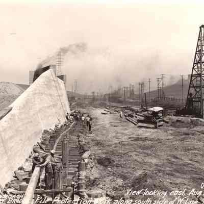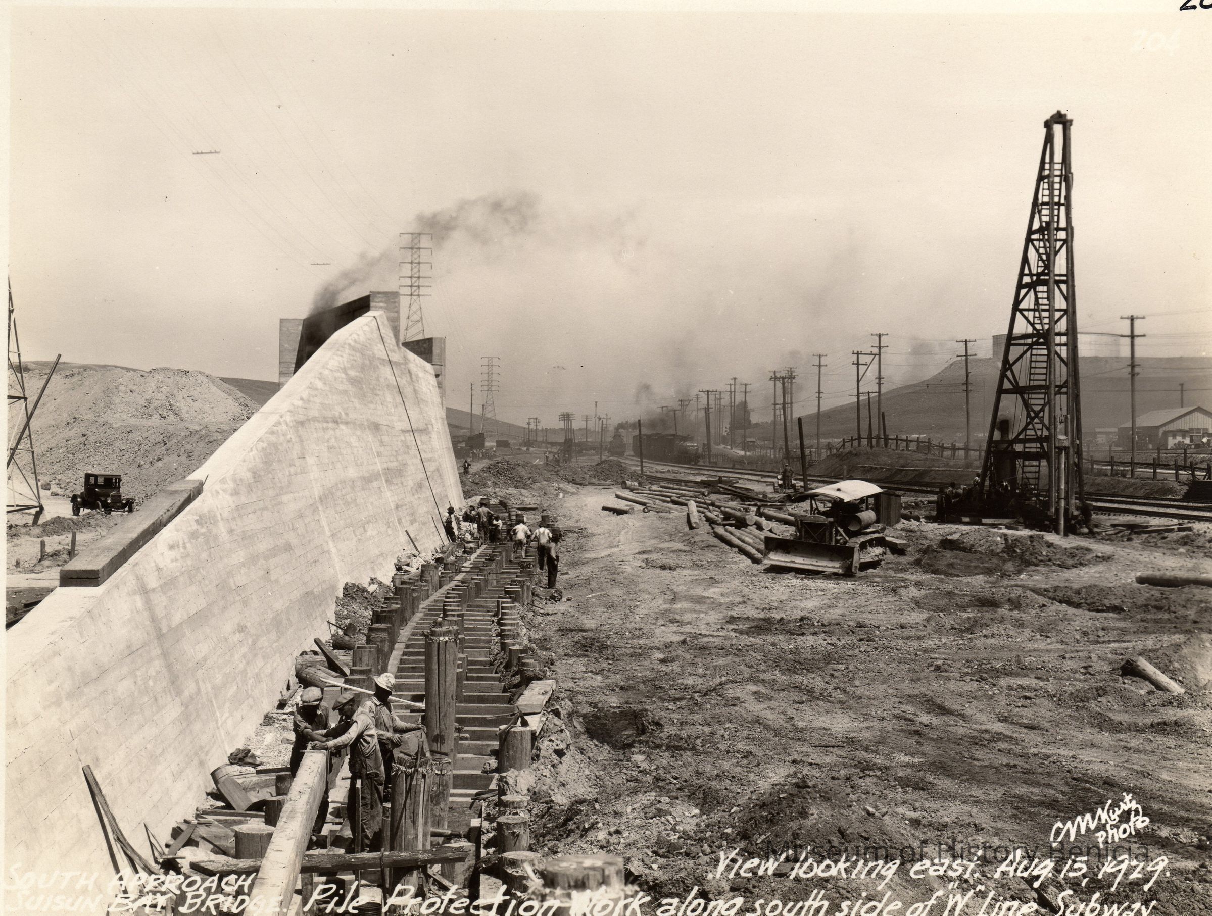 caption is: South Approach Suisun Bay Bridge Pile protection work along south side of "W" line subway View looking east