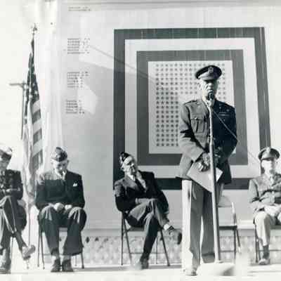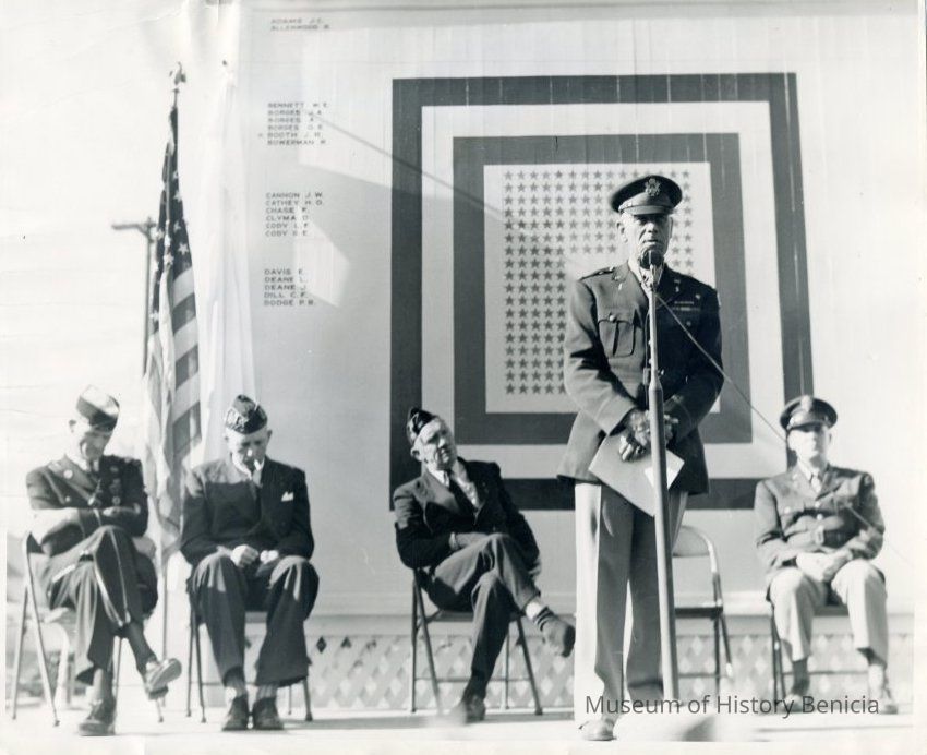 Photo of military men making speeches in front of the Benicia, CA Honor Roll. Seems to be an honor roll of people serving in World War II.Collection