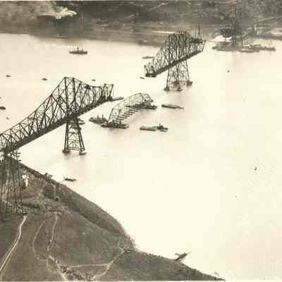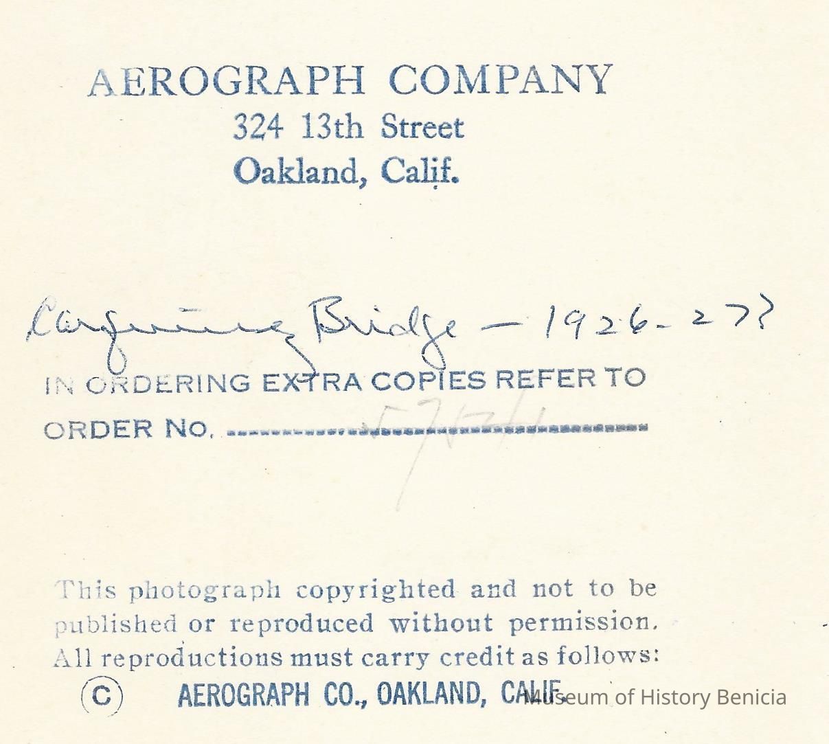 B/W aerial photo of Carquinez Bridge under construction. One section being raised, another missing. Same stamp and note on back as P3008.