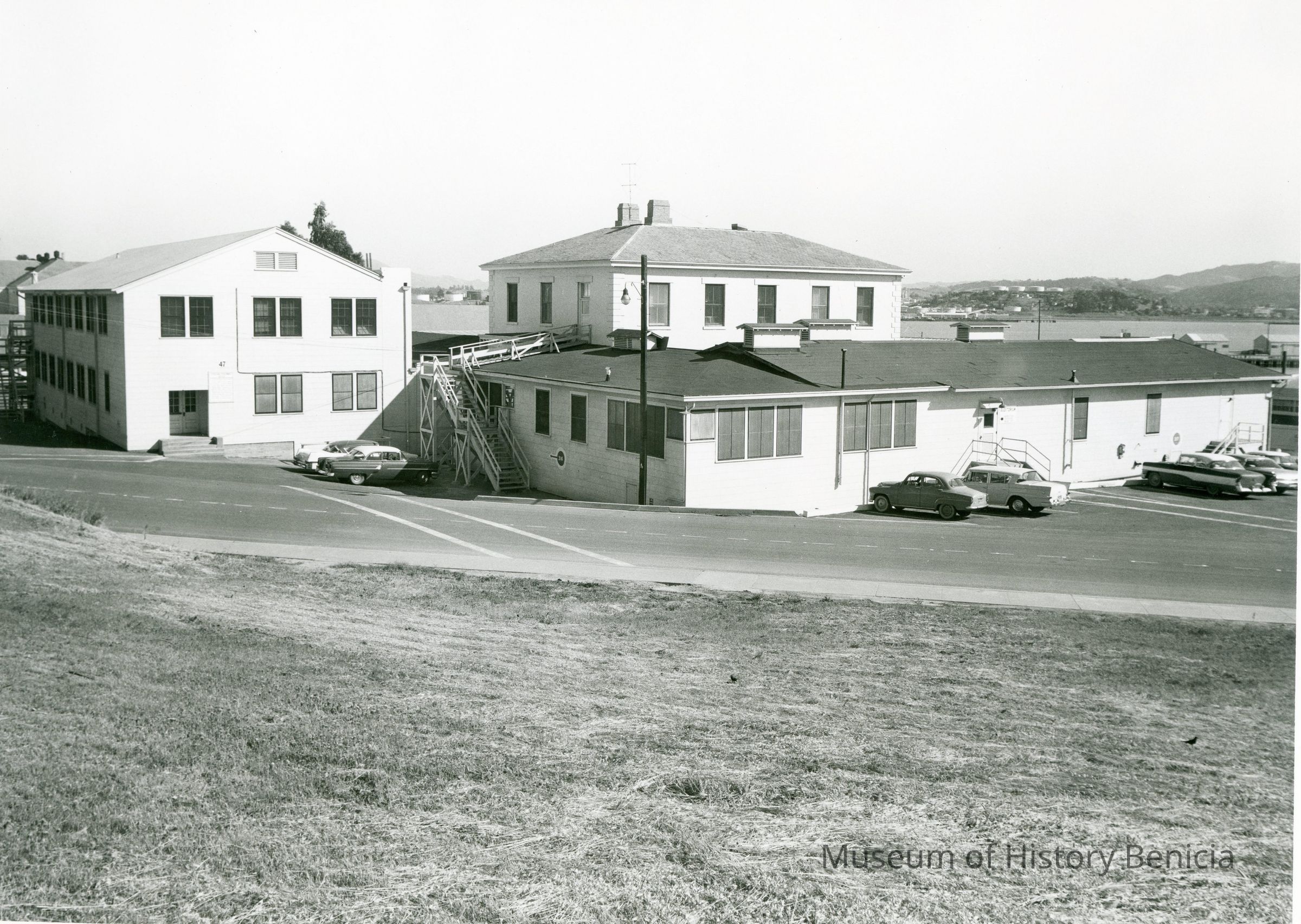 This is a photograph of a building complex at the Benicia Arsenal. It is by the water and the Martinez oil tanks and loading area can be seen in the distance.