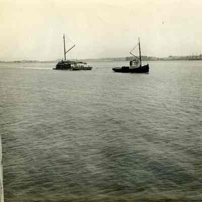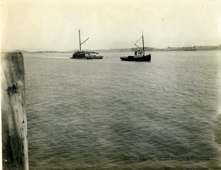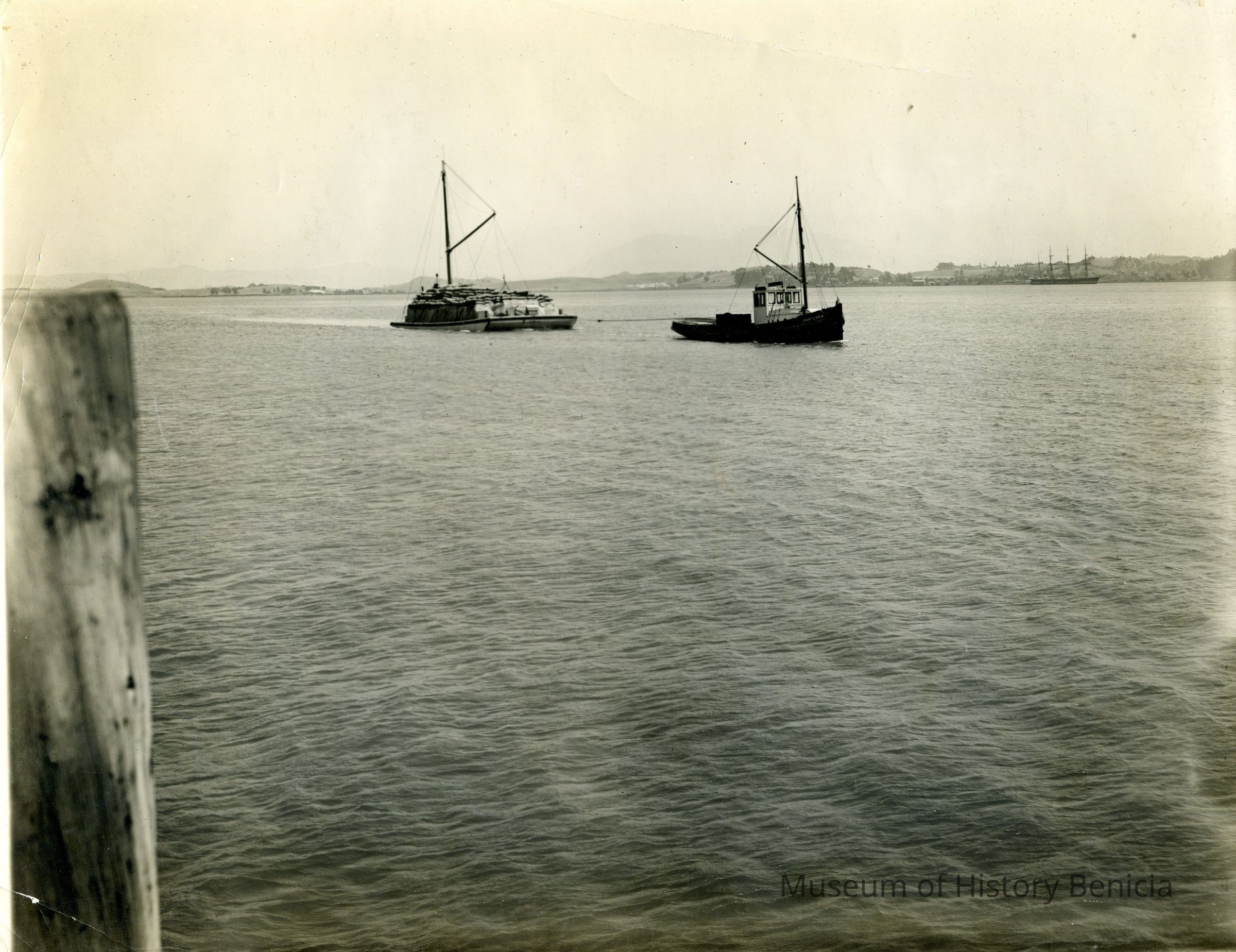 Photo of a barge being pulled by a tugboat. It looks like it was taken from the Martinez side of the Carquinez Straits looking towards Benicia.Collection