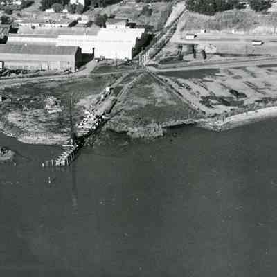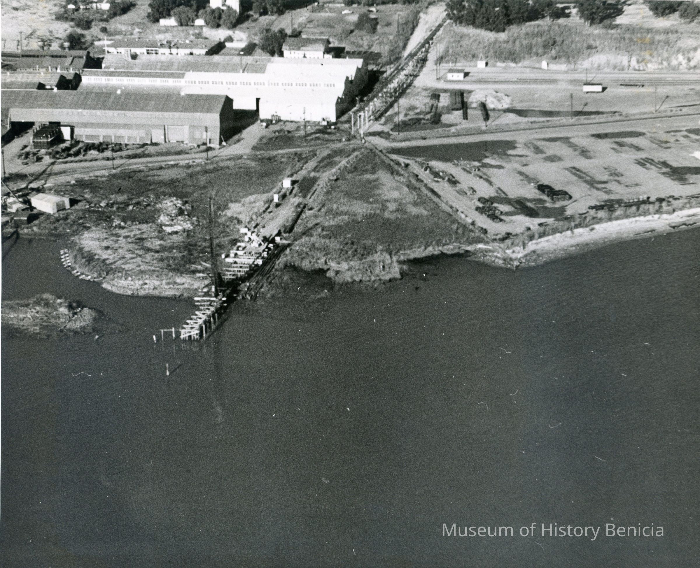 B/W aerial photo of old Yuba Complex: shows wharf, buildings, shoreline.. Healy Tibbitts Construction Company (possible pier/dock site)