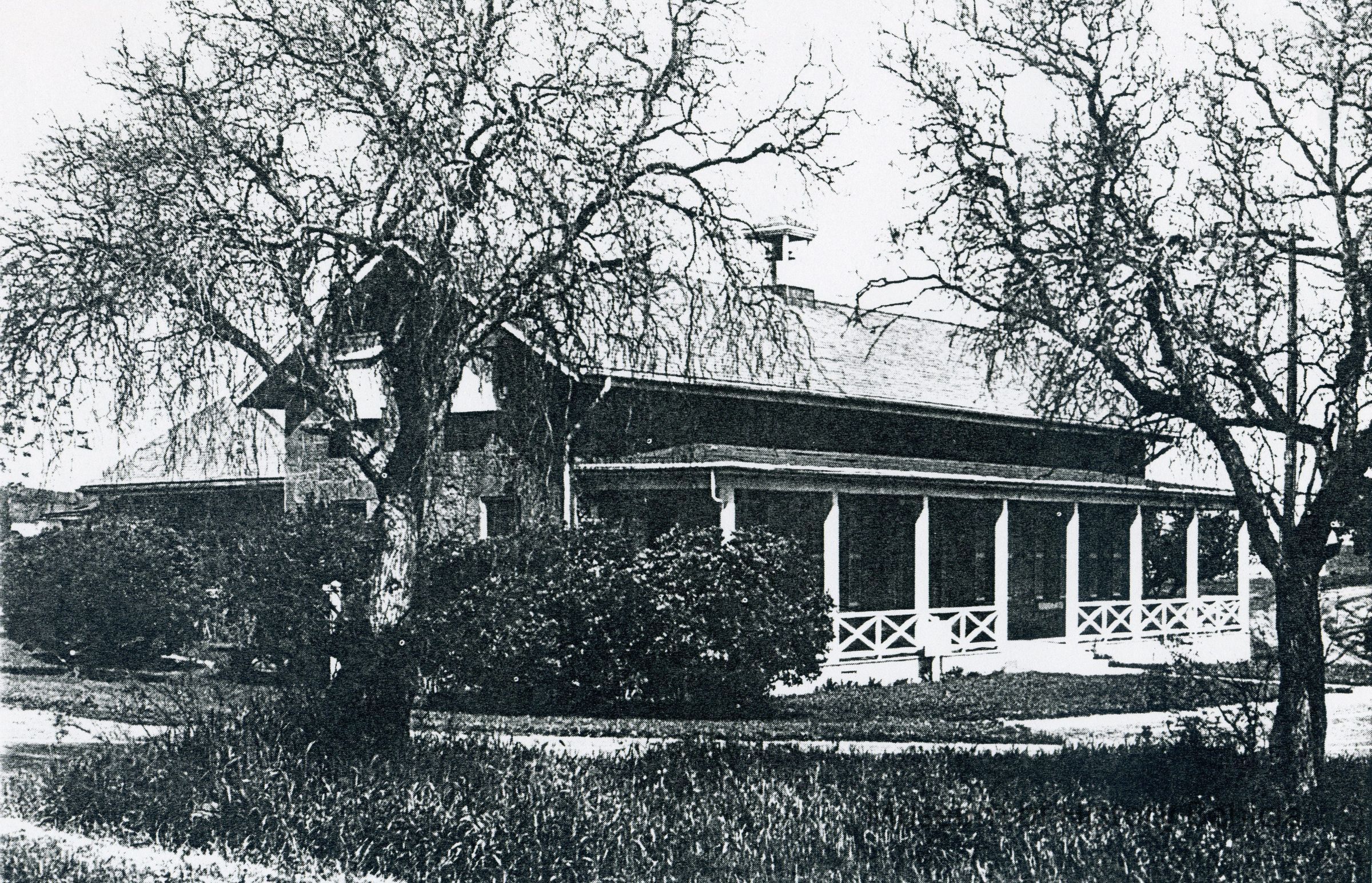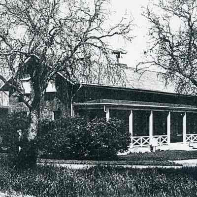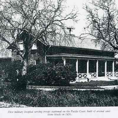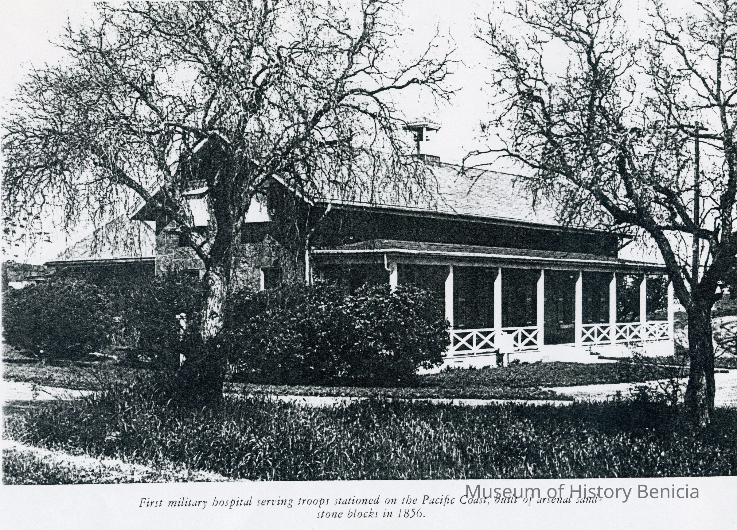 Black and white photocopy of an original photograph located at the Benicia Arsenal: "First military hospital serving troops stationed on the Pacific Coast, built of arsenal sandstone blocks in 1856.