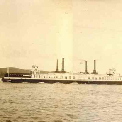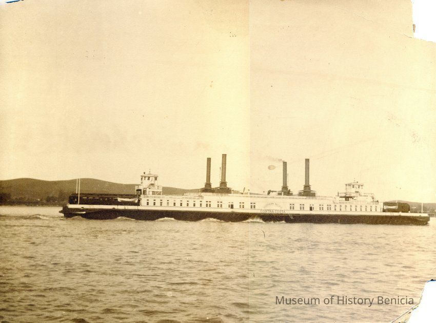 Photo of the ferryboat Contra Costa on the Carquinez Straits. This is a large photo on a cardboard backing. Two corners are missing.Collection