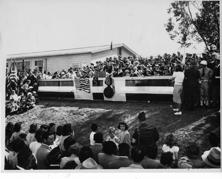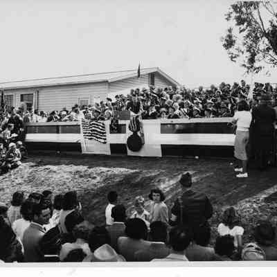 Photo shows a crowd behind a podium and others in front of the podium. There are military guards. Has a banner for the "centenial committee" next to podium.Collection