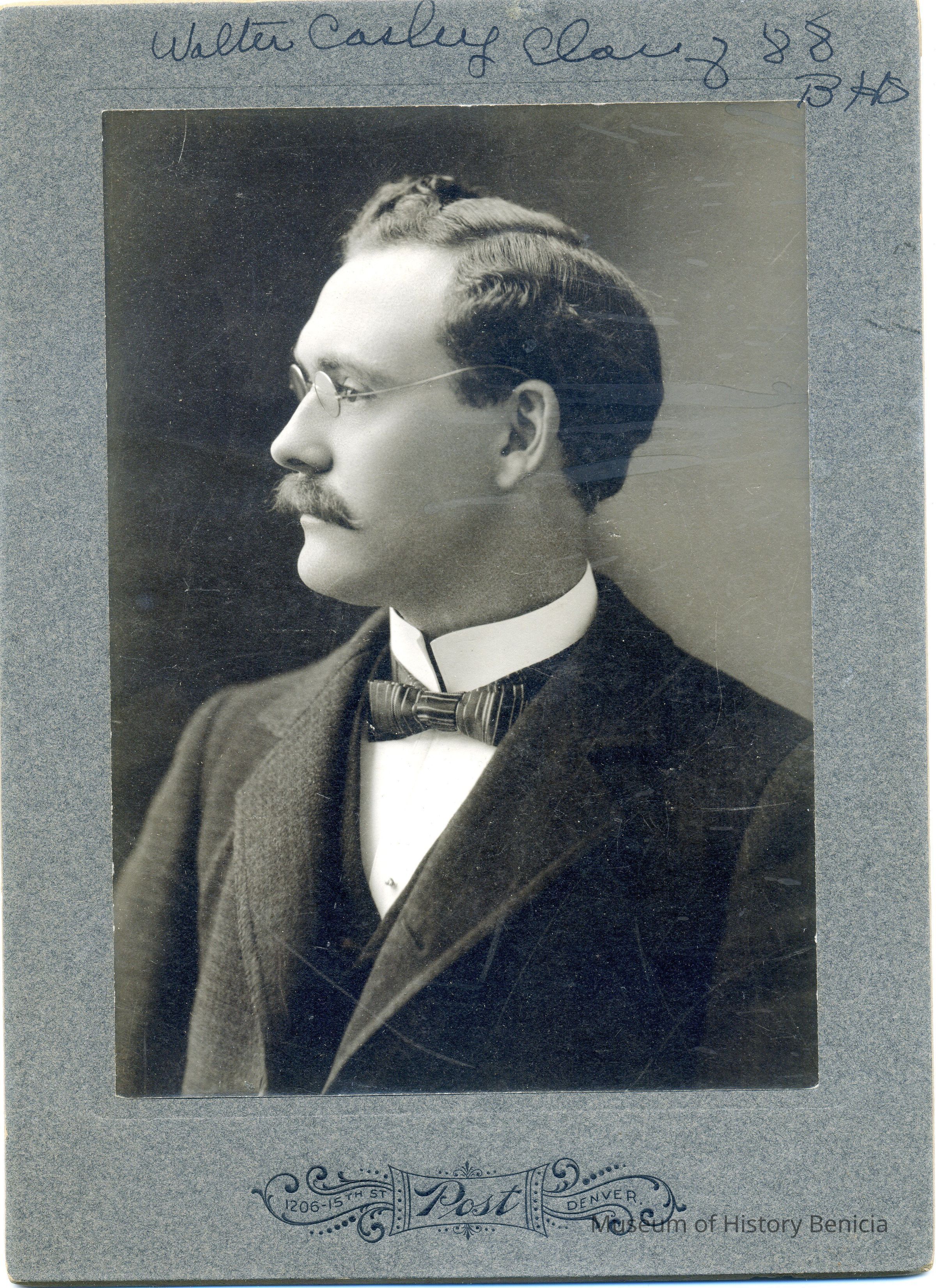 A cabinet card of a man taken in Denver Colorado. Written on top it says this is Walter Casley Class of 88 BHS. This could stand for Benicia High School. If the year of graduation is 1888 it seems too early for the Benicia High School.