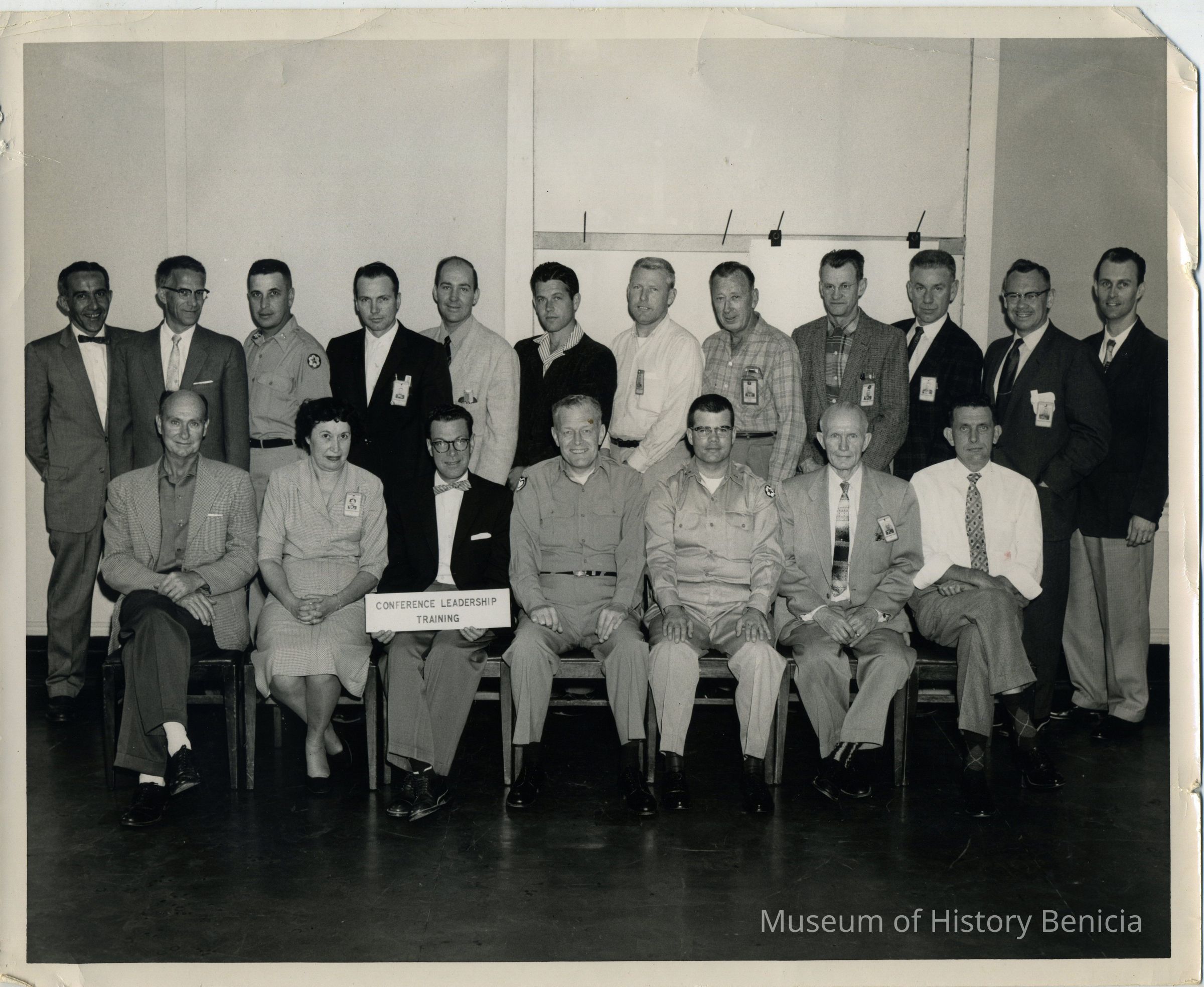 Leadership training group. Clair Nelson in front row; Don Nelson in top row, 4th from right; Gaylord Yokum, top row, 2nd from right. Black and white photo.Collection