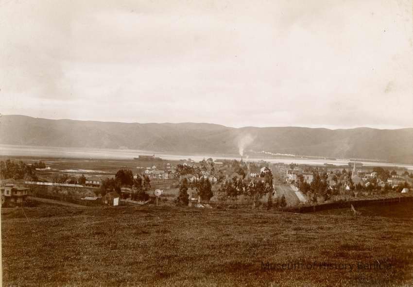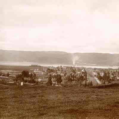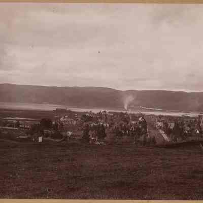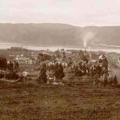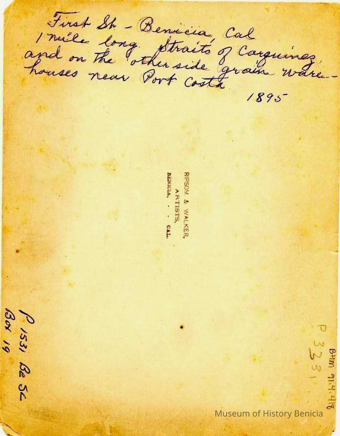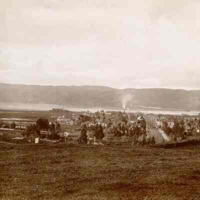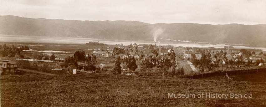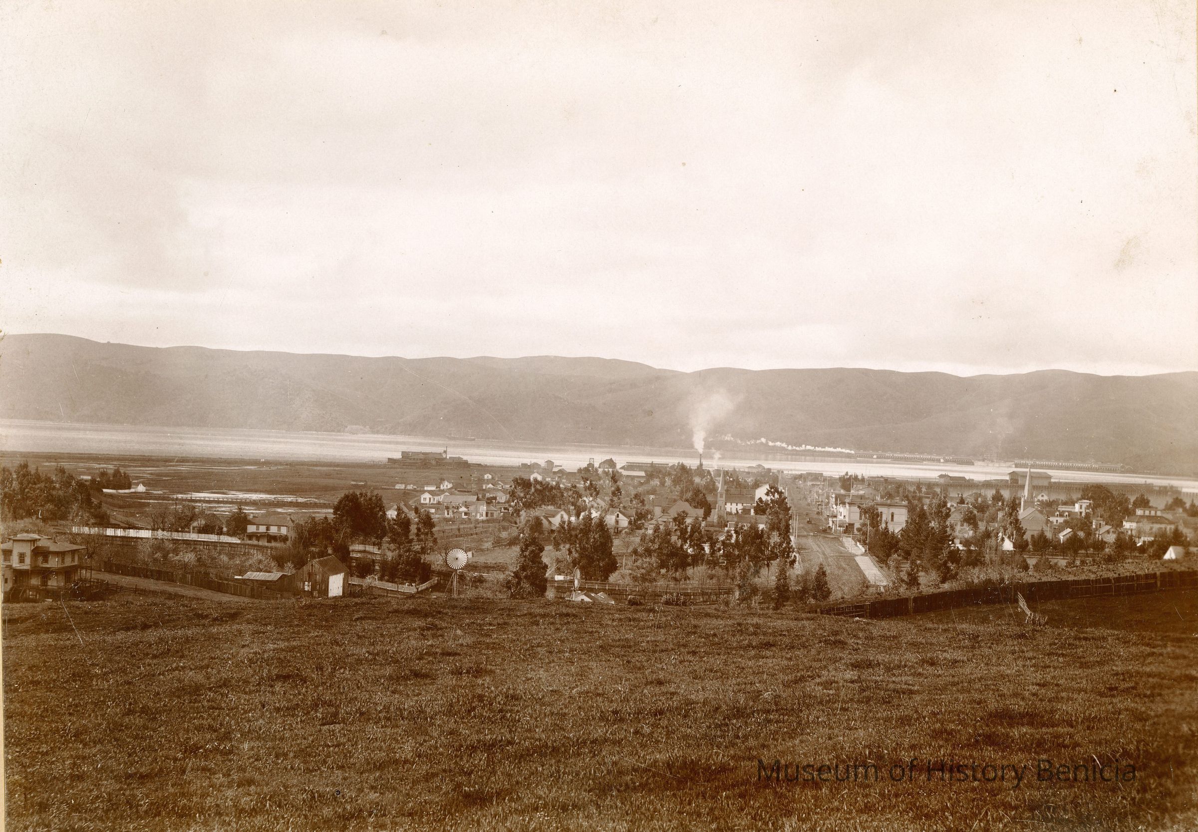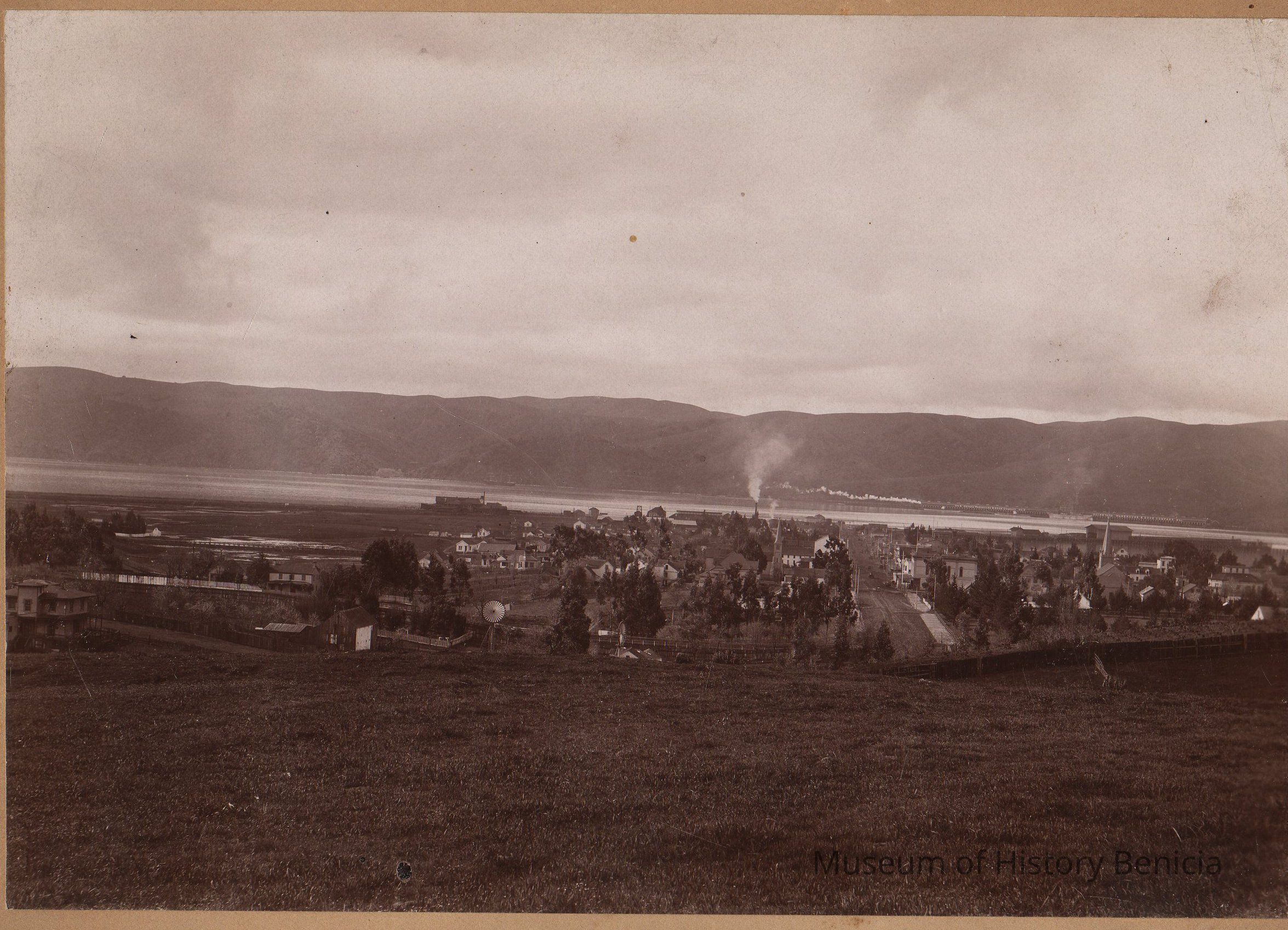 B/W Photograph: view of Benicia looking down First Street across Carquinez Strait to Port Costa. Photo dated 1895 but appears to be much earlier.