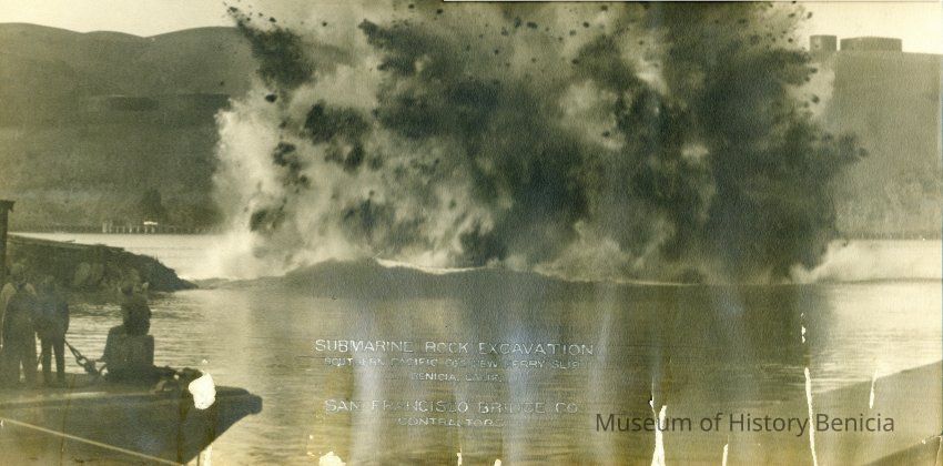 Demolition of the ferry slip no longer needed for the Southern Pacific Train ferries from Benicia to Port Costa because of the completion of the Southern Pacific Railroad Bridge across the Carquinez Straits. Likely date is 1930-31.