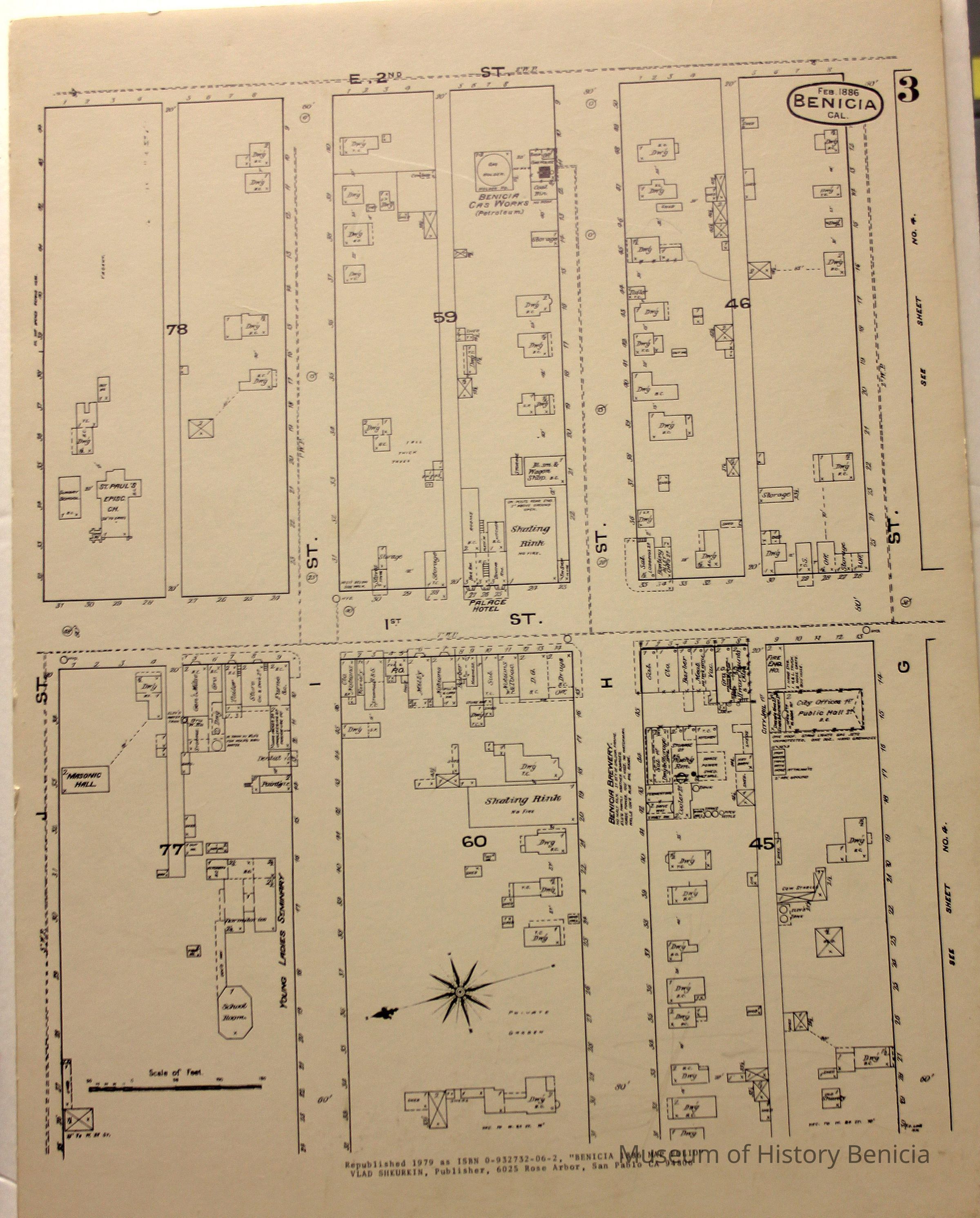 A black and white reproduction of a Benicia Sanborn Map from February 1886 republished in 1979 as ISBN 0-932732-06-2 "Benicia 1886 Map Folio"