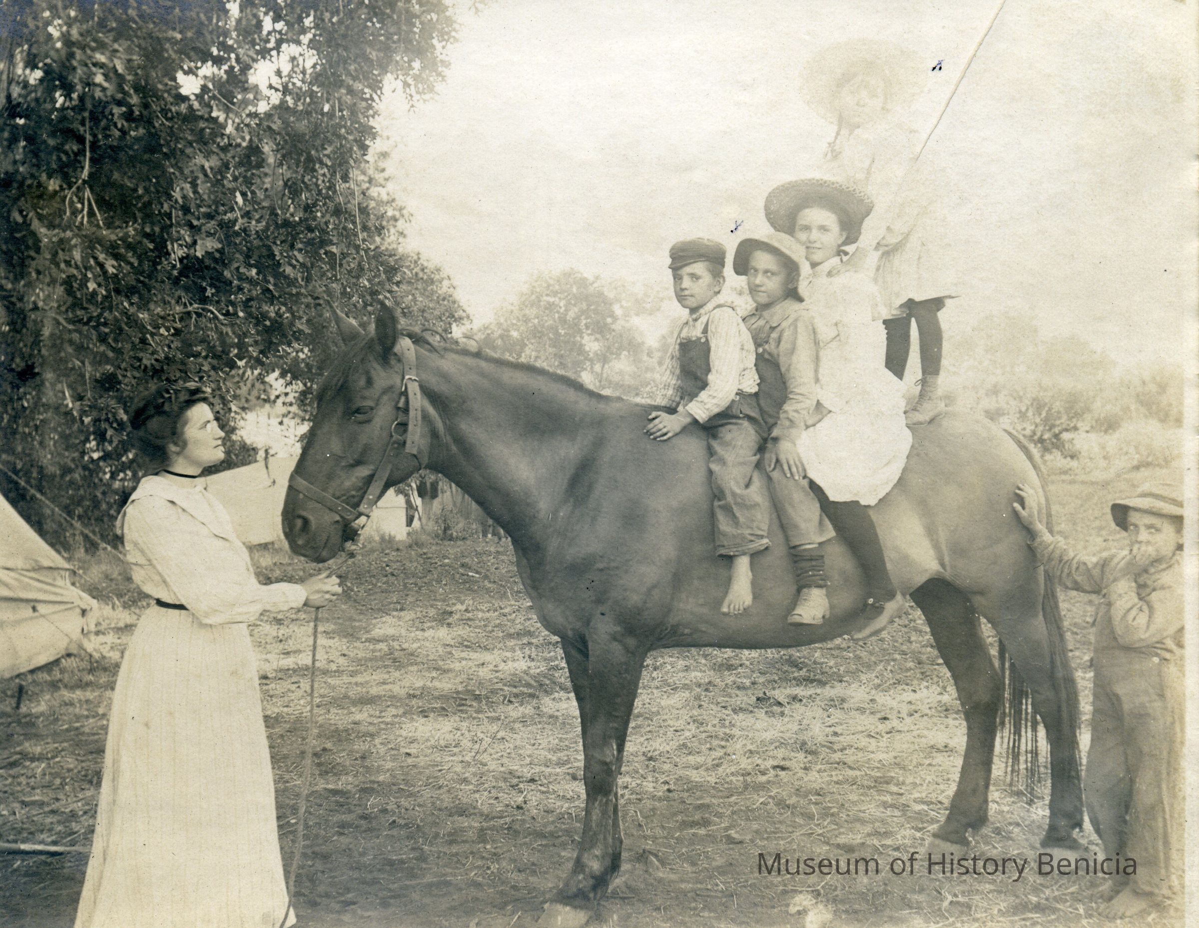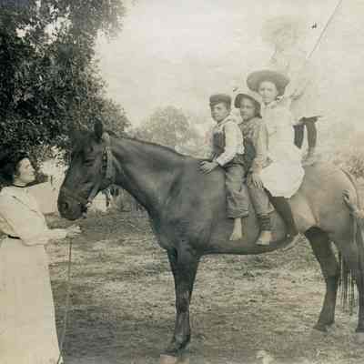 The photo is of four children on a horse (one standing upright) with another boy standing next to the horse and a woman holding the reins.Collection