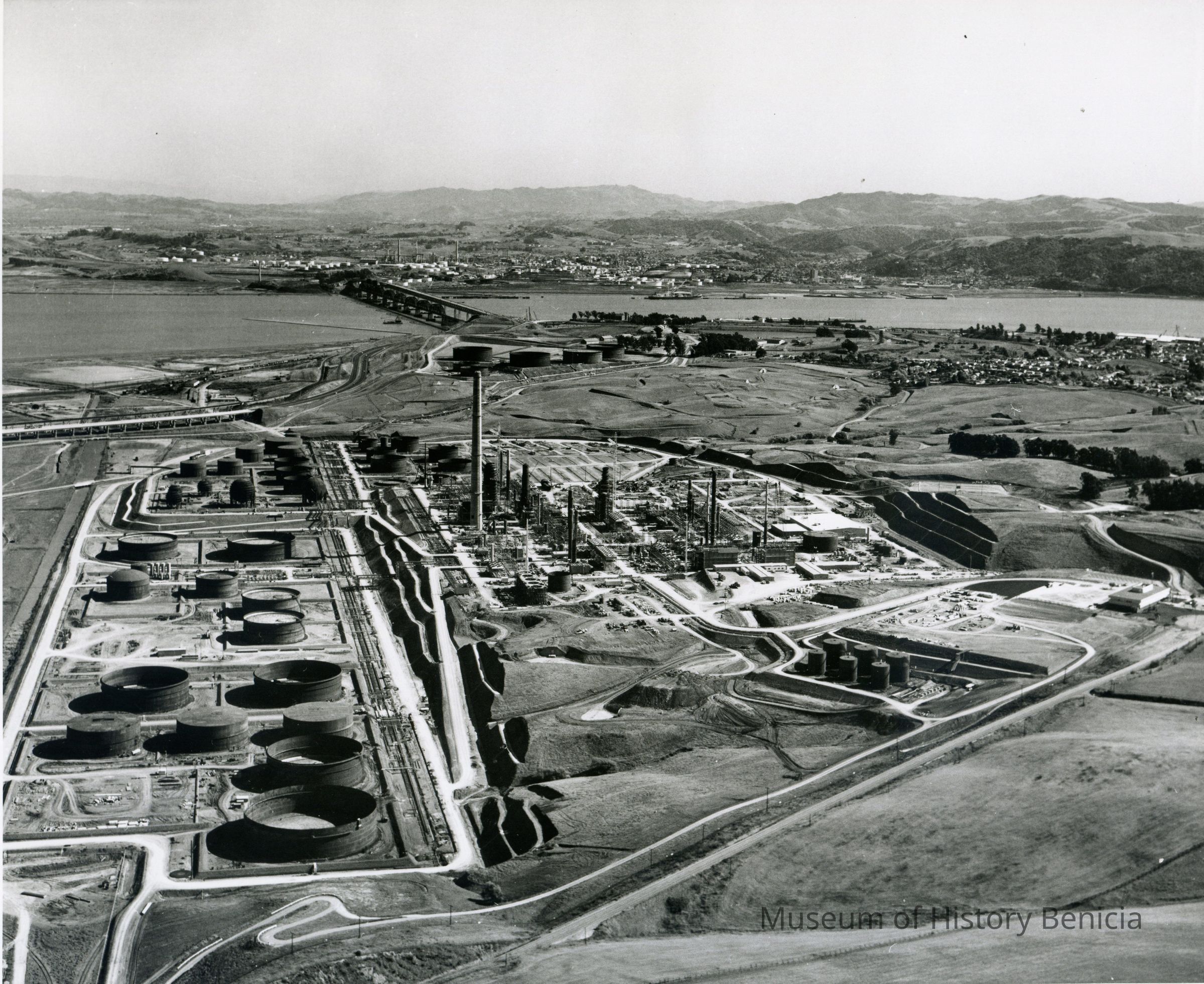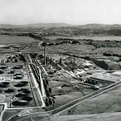 across lower portion: storage tanks, hiway 680, refinery equipment being assembled, tall smoke stack (center) terraced hillside, administration building on East Second Street.Collection