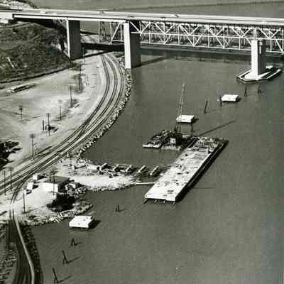 B/W aerial photo - enlargement of center section of BHM99.11.532 to focus on dock/pier construction