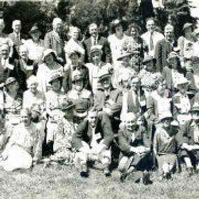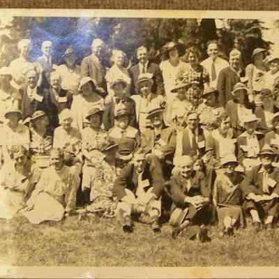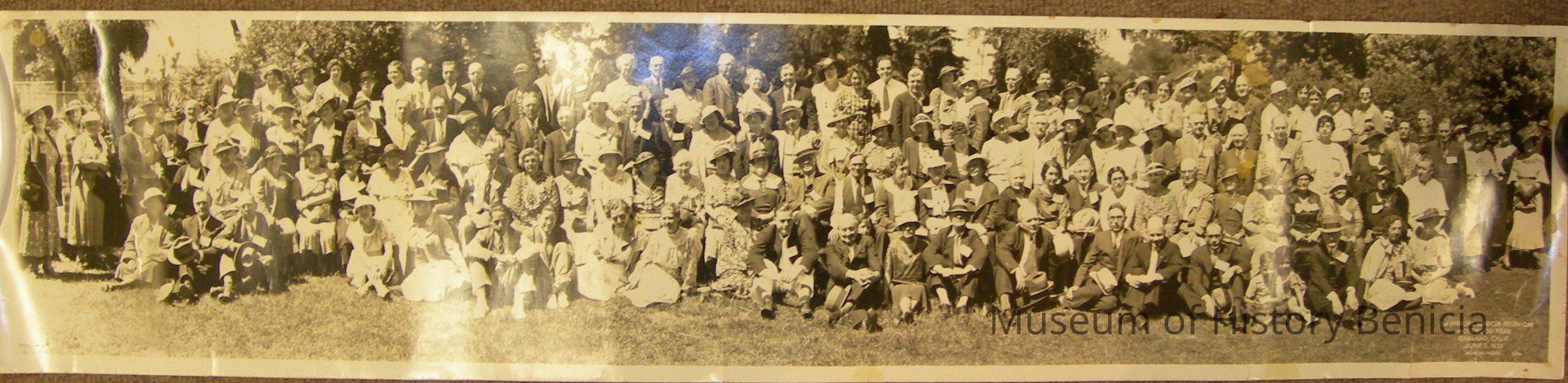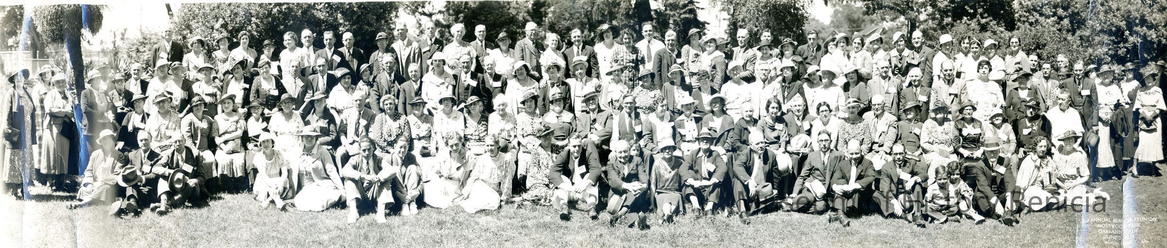 panaroma of young and old man and women sitting and standing on grass in about 4 rows. "3rd Annual Benicia Reunion/Mosswood Park/Oakland Calif./June 2, 1935/Morton Photo 5154" at lower right. "Milo Passalacqua" on back in ink. 6-2-35 (similar photo to P934 - BHM 93.100.91)Collection