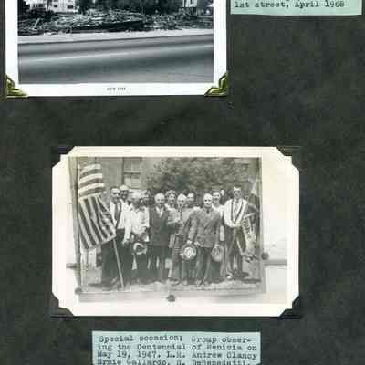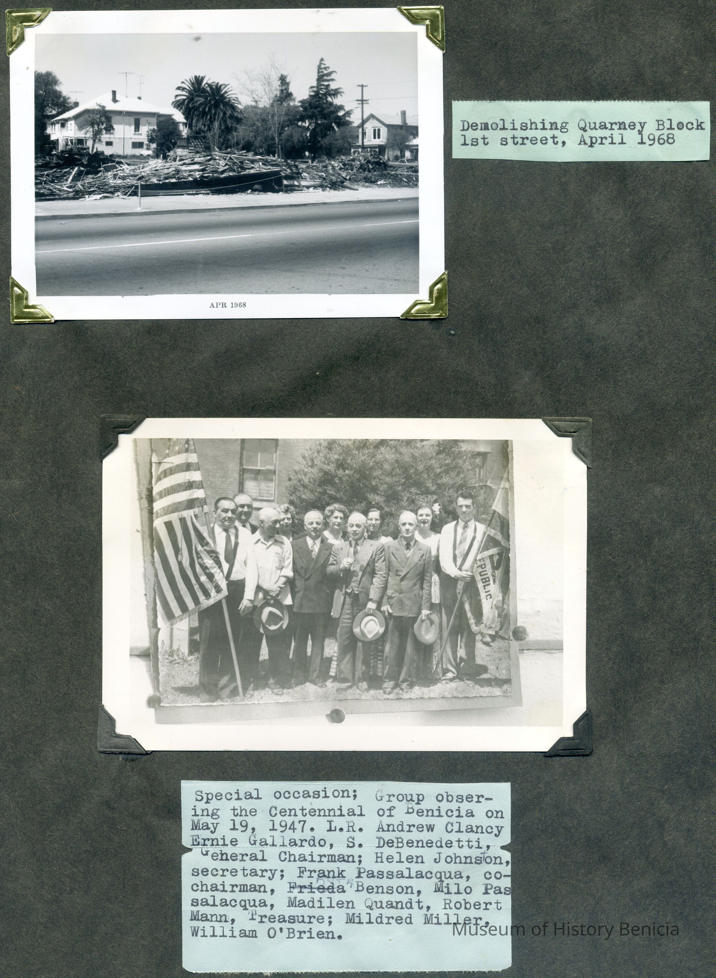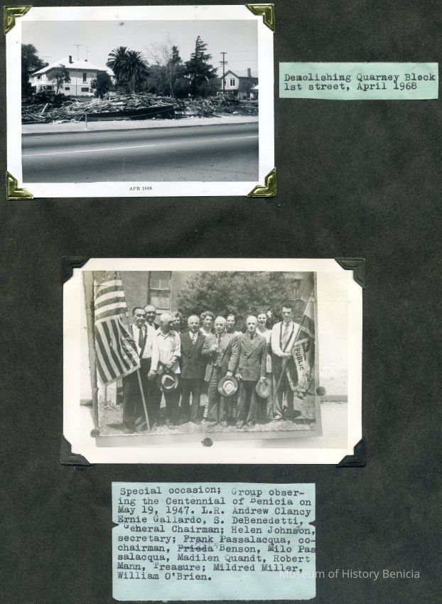 B/W photograph of demolishing Quarney Block 1st St, April 1968 and special occasion: group observing the Centennial of Benicia on May 19, 1947. Left to Right: Andrew Clancy, Ernie Gallardo, S. DeBenedetti, General Chairman; Helen Johnson, secretary; Frank Passalacqua, co-chairman, Ruth Benson, Milo Passalacqua, Madilen Quandt, Robert Mann, treasurer; Mildred Miller, William O'Brien.Collection