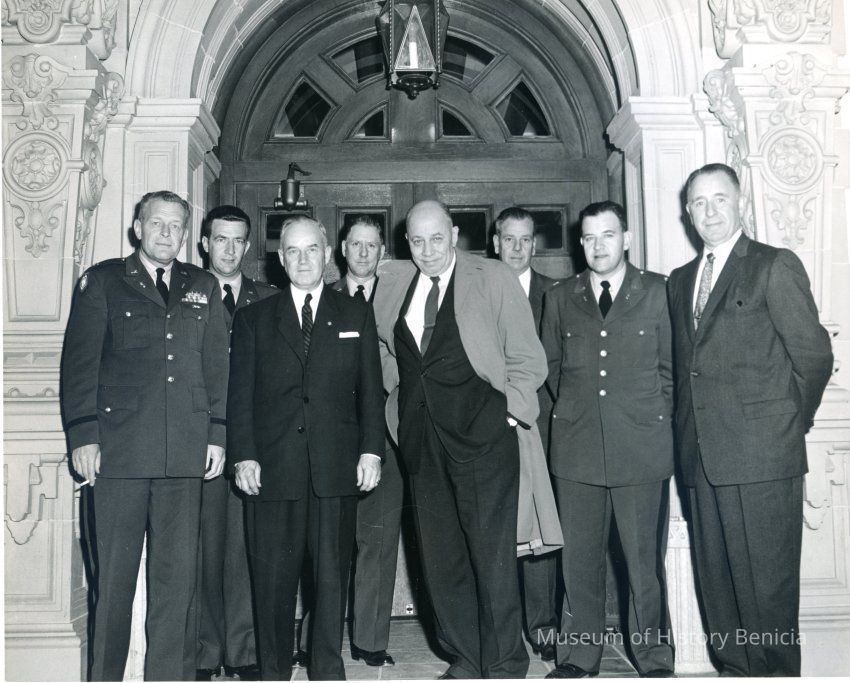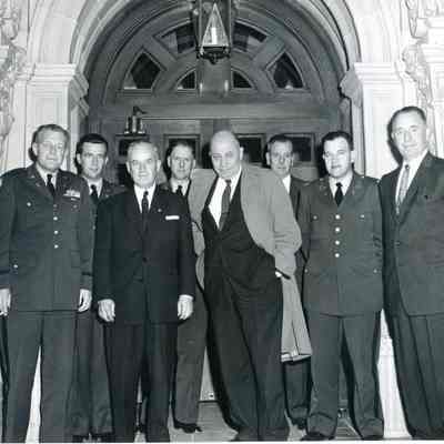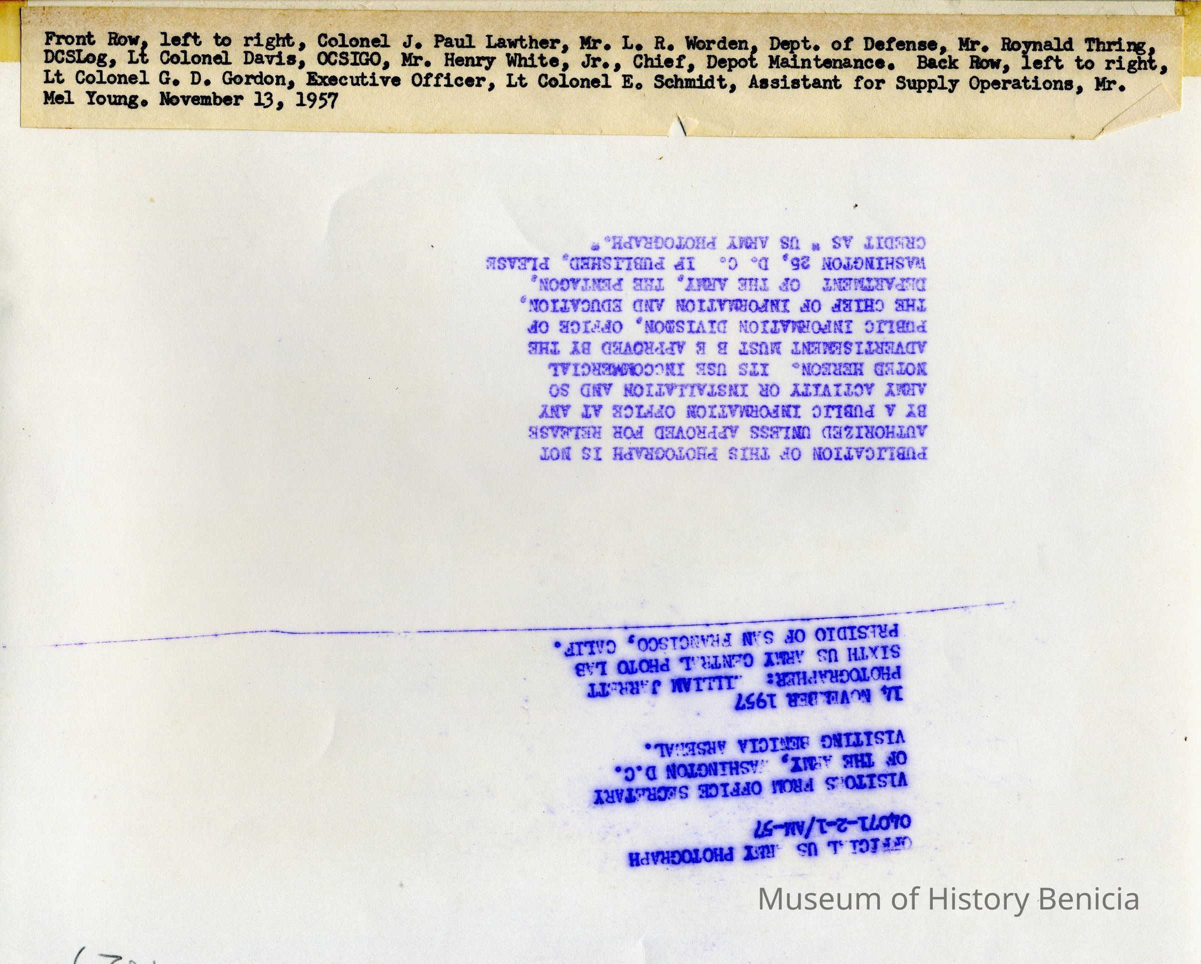 In front of headquarters building: Col. J. Paul Lowther; Mr. L.R. Worden, Dept. of Defense; Mr. R. Thring, DESLOQ; Lt. Col. Davis, OCSIGO; Henry White, Chief Depot Maint., B.A.; Lt. Col. Gordon, Exec. Officer; Lt. Col. Schmidt, Asst. Supply Operations; Mel Young, Supply Oper.Collection