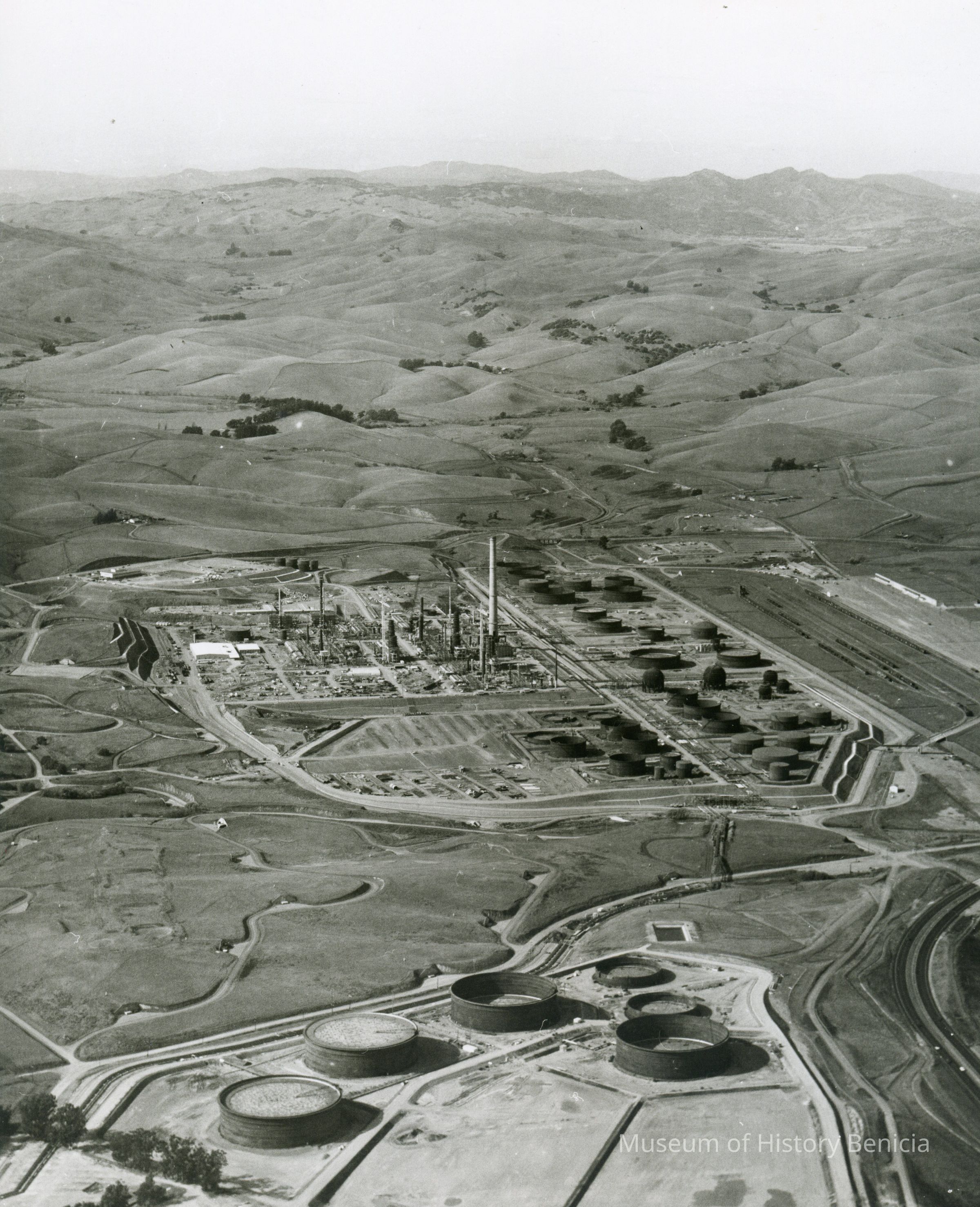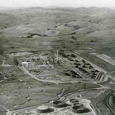 looking north east: across top: empty hills spotted with trees; across center: refinery equipment being assembled, tall smoke stack (in center) storage tanks under construction, railroad cars on sidings, warehouses; across bottom: in-ground storage bunkers with access roads, more storage tanks.Collection