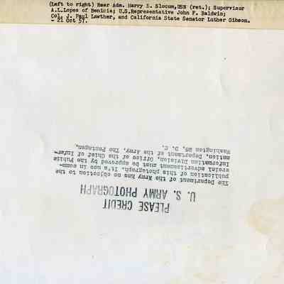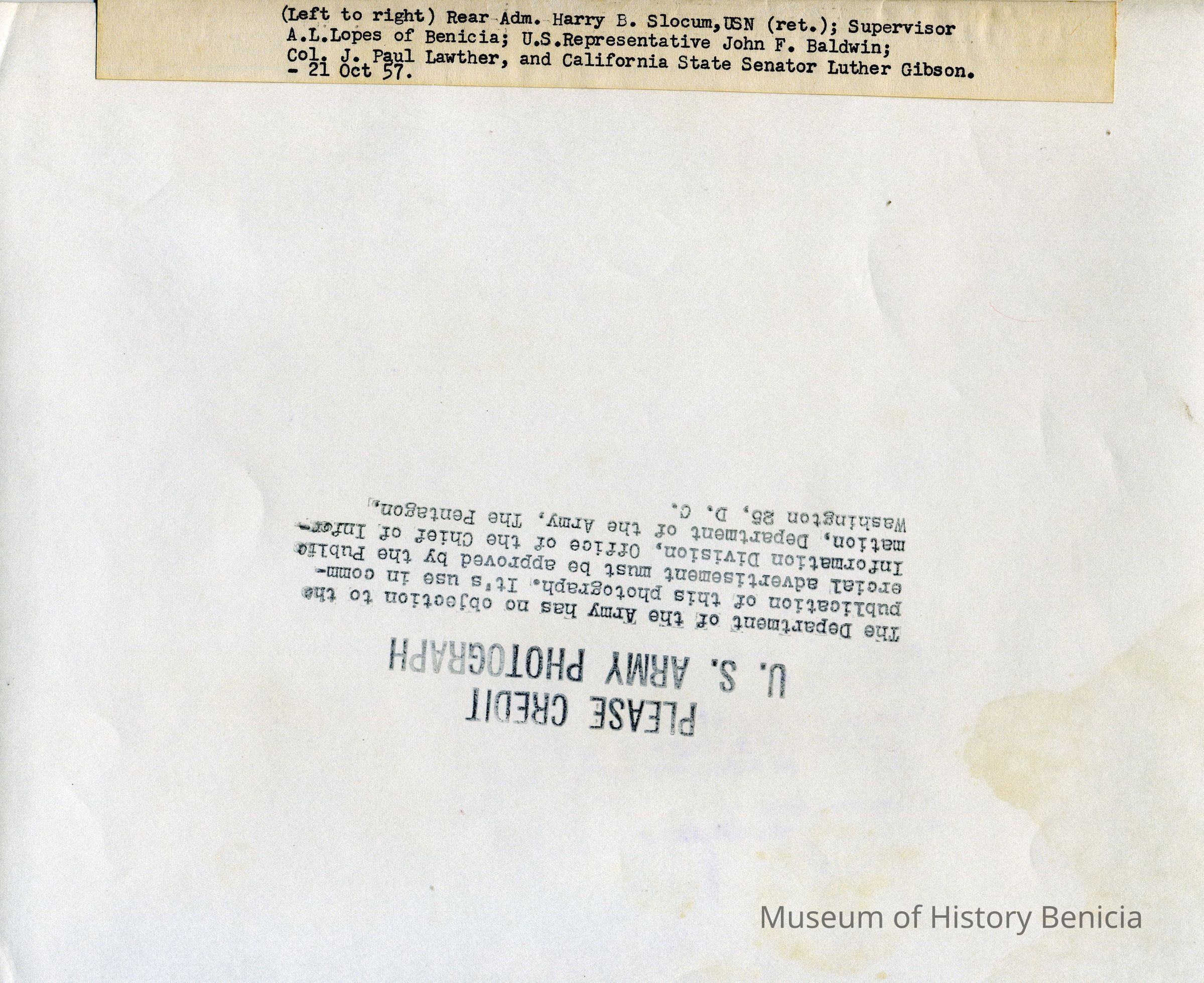 Rear Admiral Harry B. Slocum, USN (ret.); Supervisor A.L. Lopez, Benicia; U.S. Rep. John Baldwin; Col. Lawther; Cal. State Senator Luther Gibson.Collection