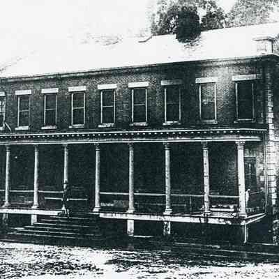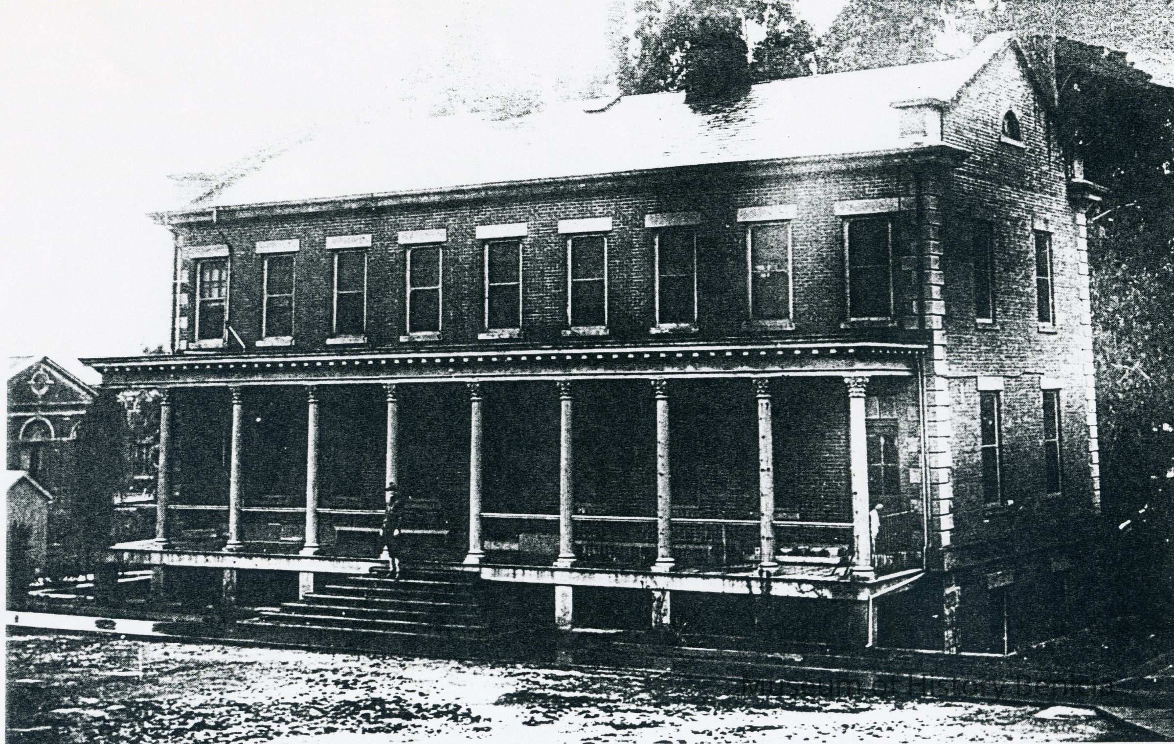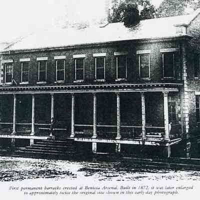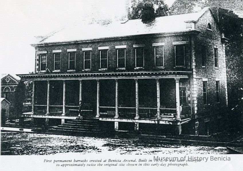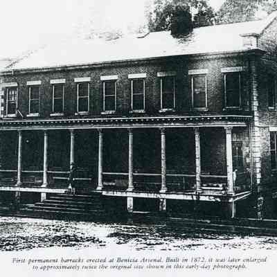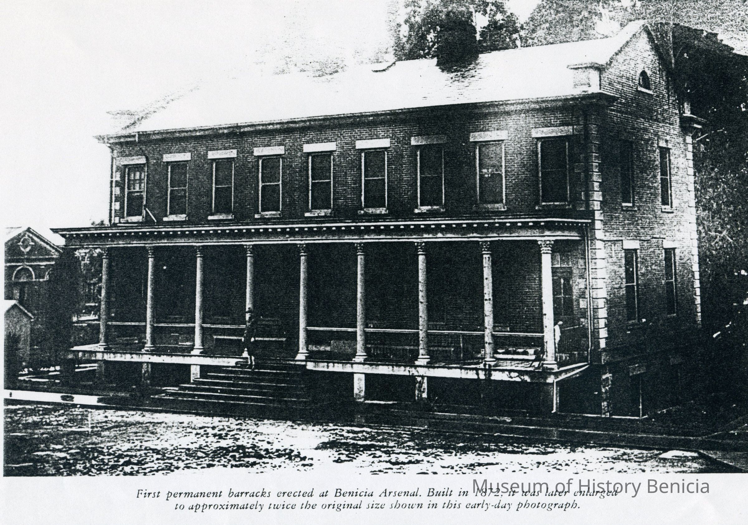 B/W photocopy of an original photograph located at the Rock Island Arsenal: "First permanent barracks erected at Benicia Arsenal. Built in 1872, it was later enlarged to approximately twice the original size shown in this early-day photograph.Collection