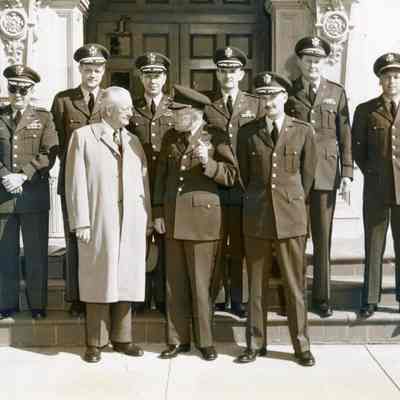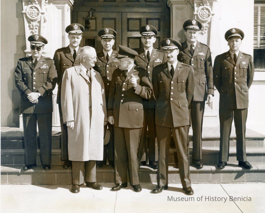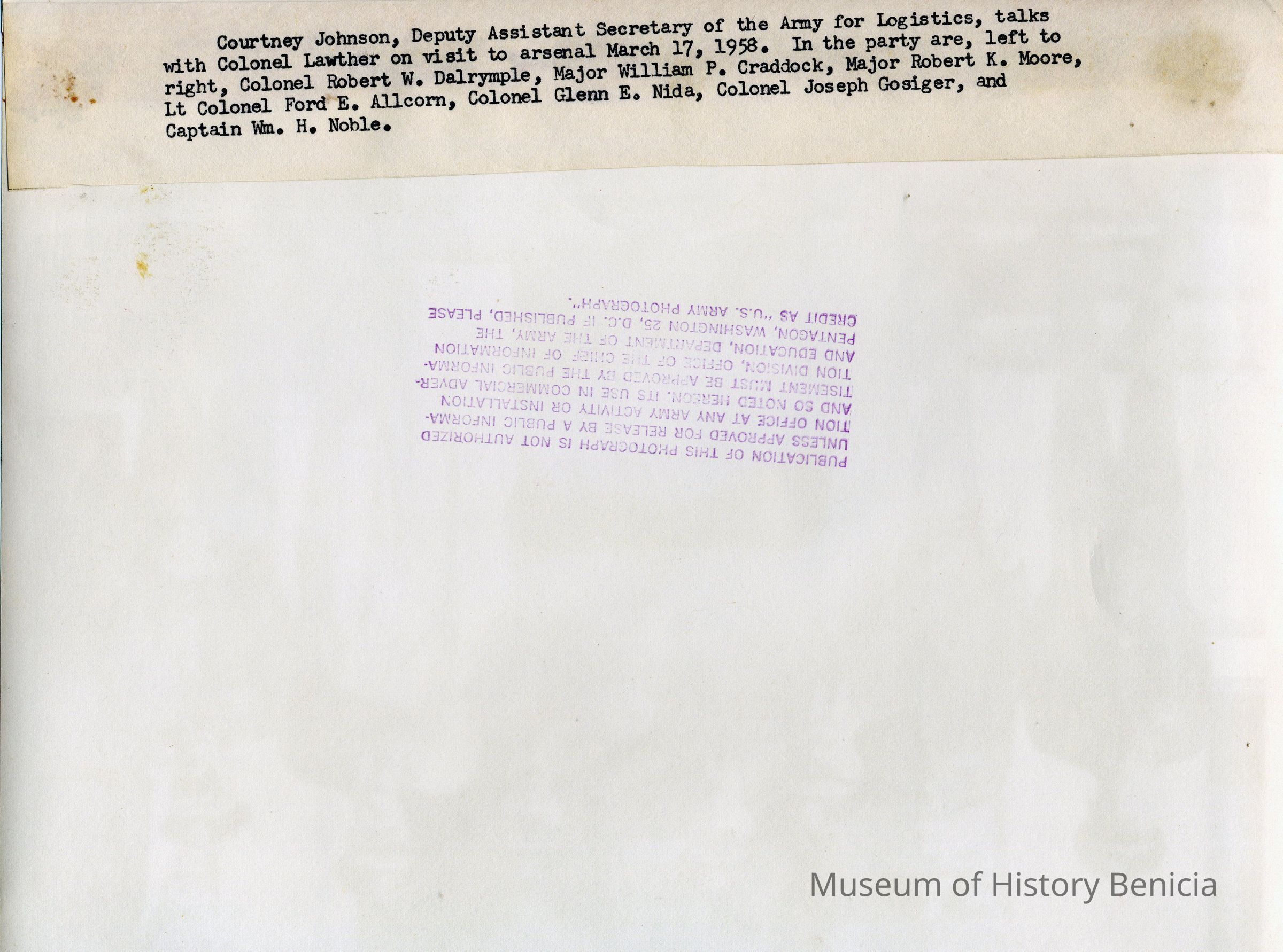 Courtney Johnson, Dept. Asst. Secty. of Army for Logistics, Wash. D.C.; Col. J. Paul Lawther, C.O., Benicia Arsenal; Col. Robert Dalrymple; Maj. Wm. Craddock; Maj. Robert Moore; Lt. Col. Ford Allcorn; Col. Glenn Nida; Col. Joseph Gosiger; Capt. William Noble. Black and white photo.Collection