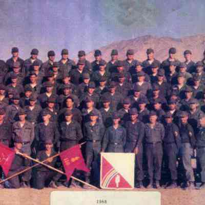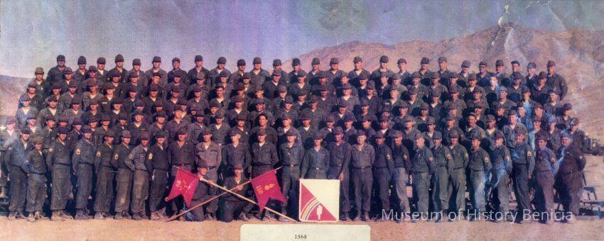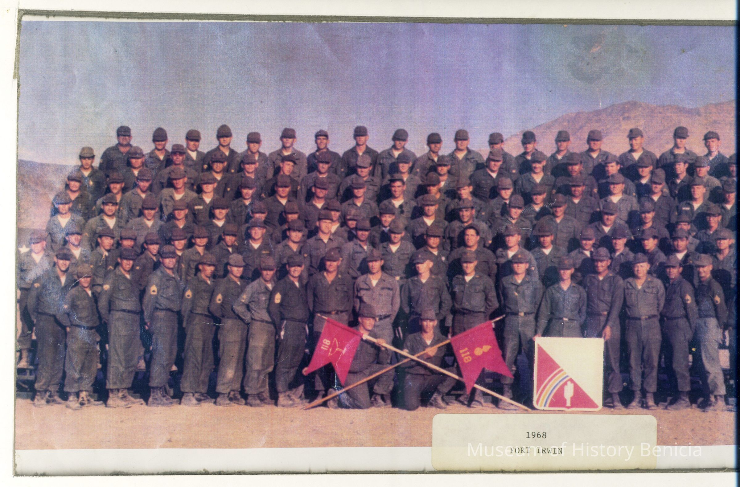 Color photograph in white matte of a group of uniformed men at Fort Irwin in 1968.