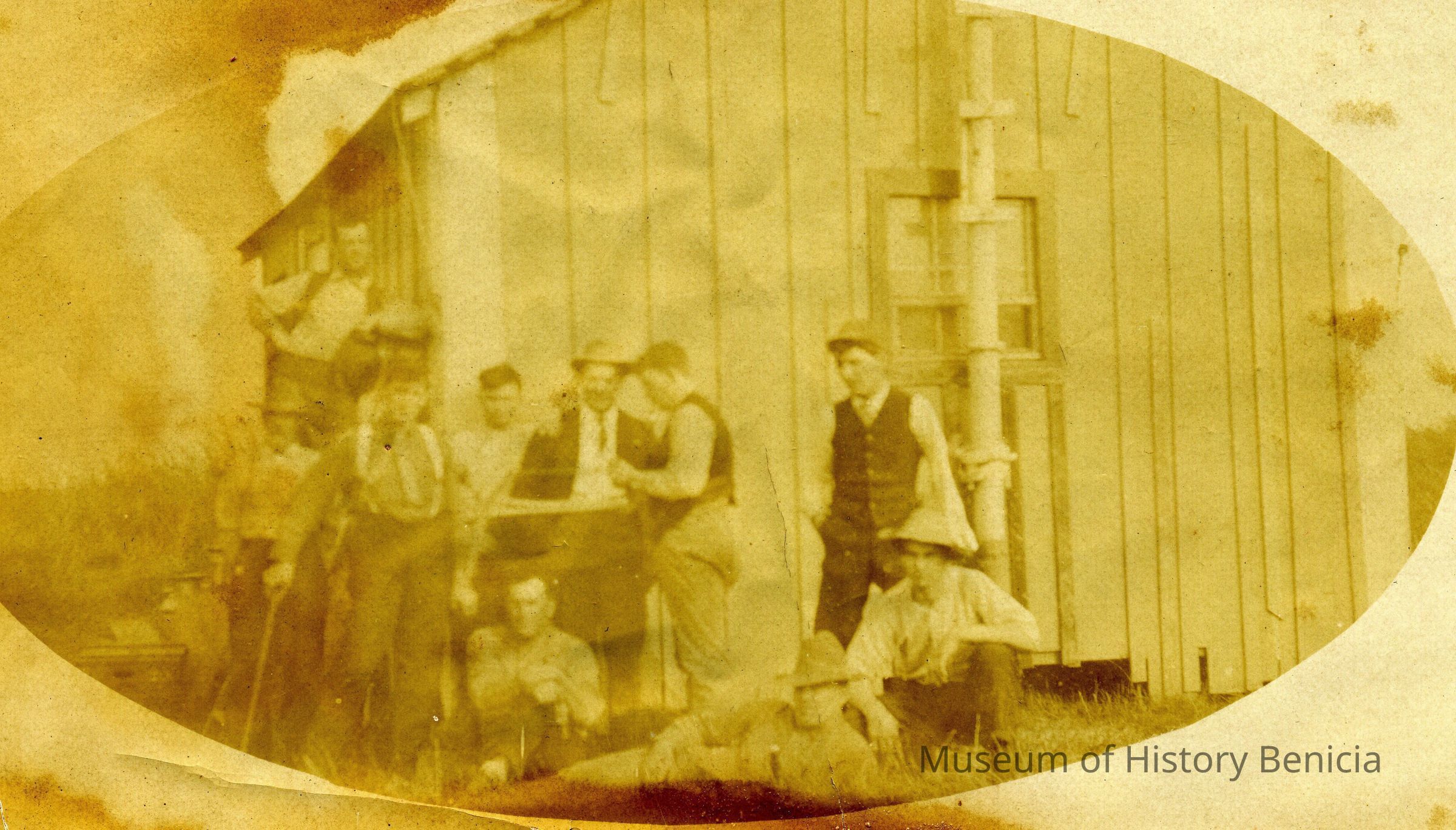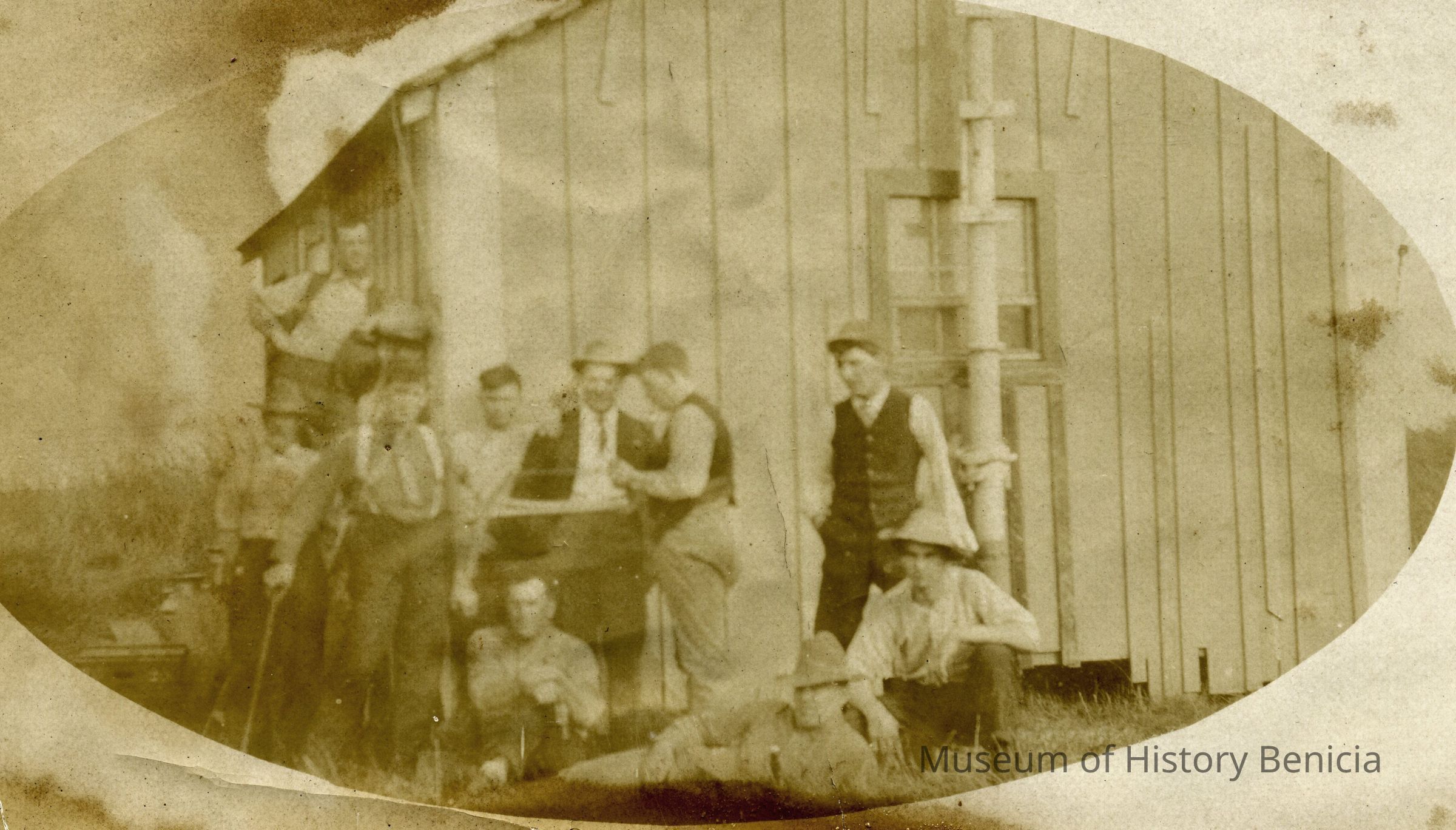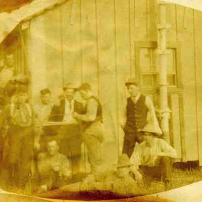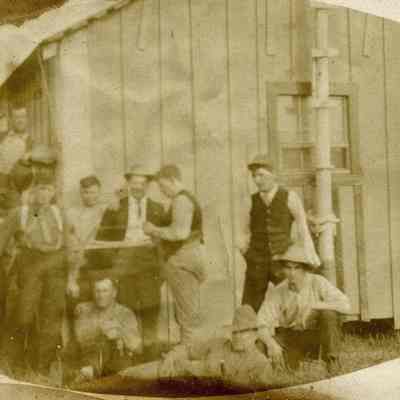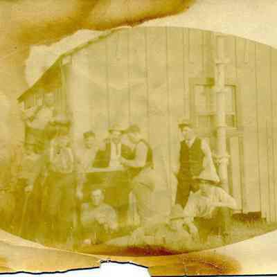 B/W photograph of a group of guys in front of a building. On the back is written the word "unknown". The image is oval and was printed on a square paper. The only clue as to the subject of this photo is a milk can in the background.