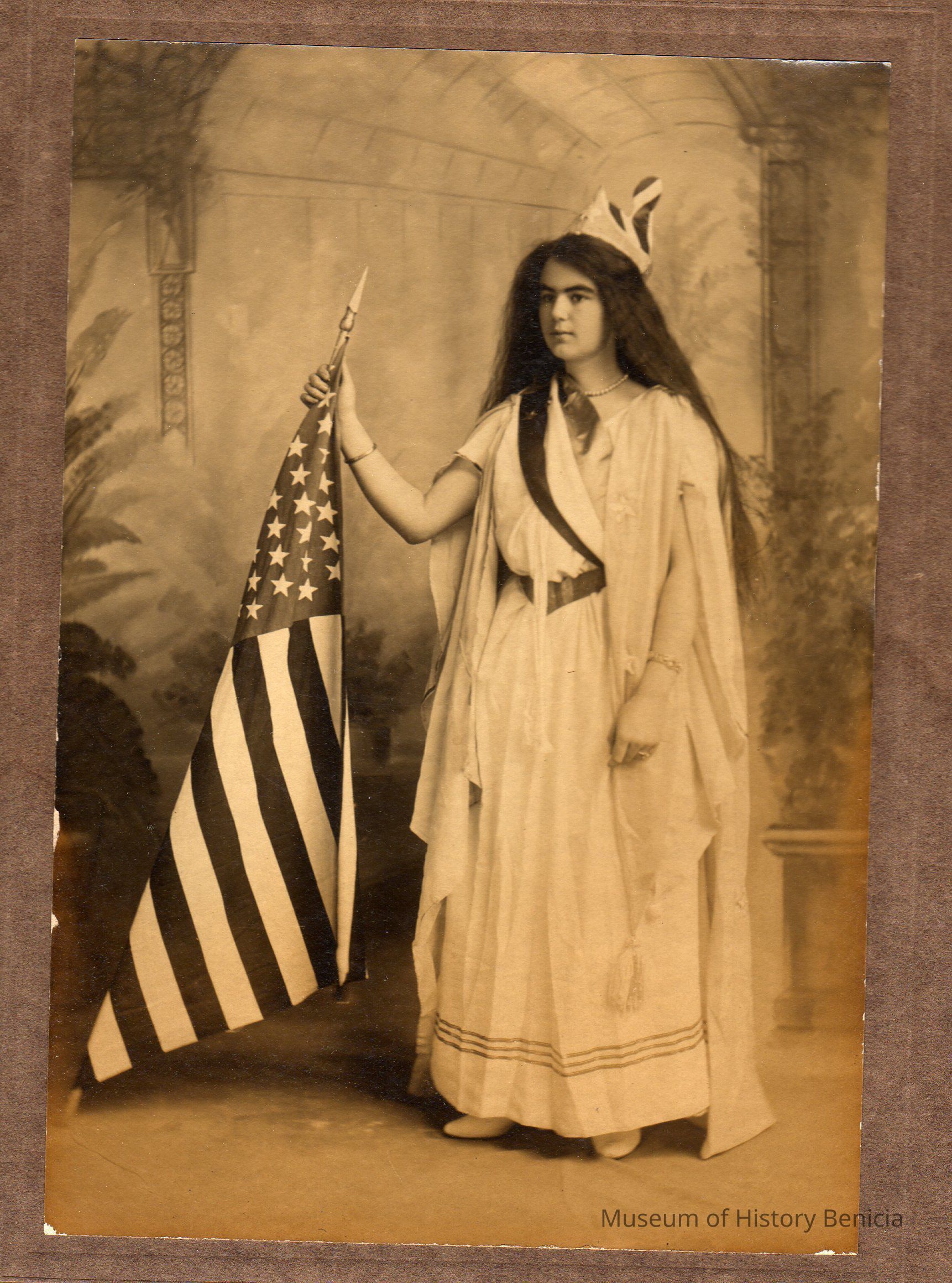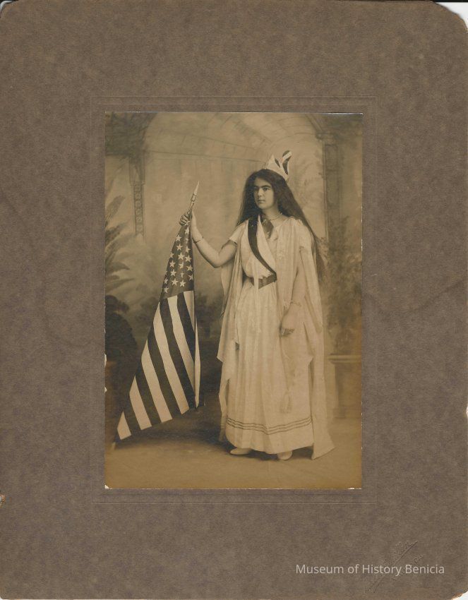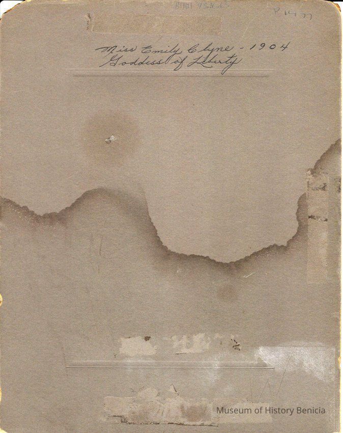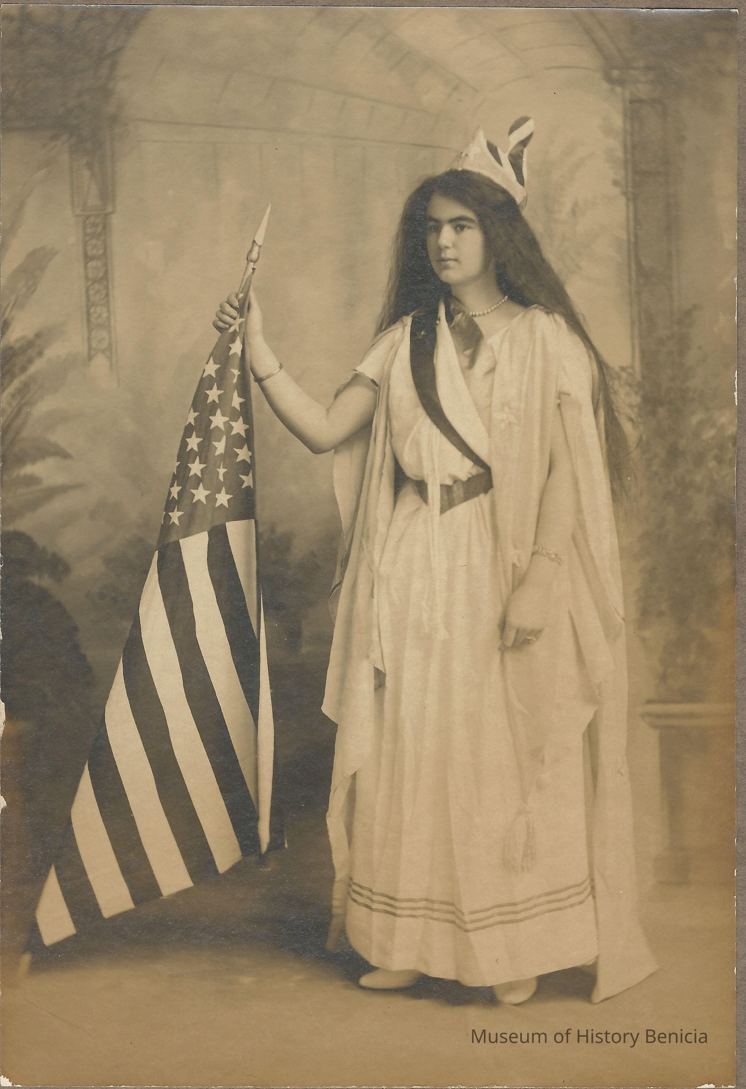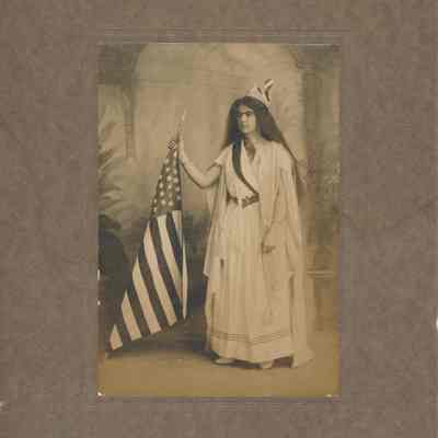 Emily Clyne as "Goddess of Liberty", 1904. B/W photo.