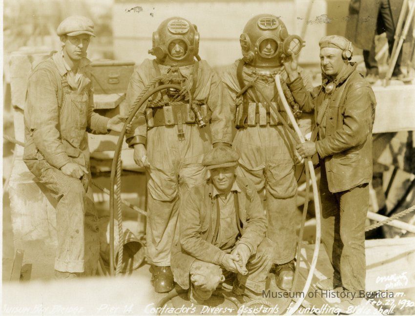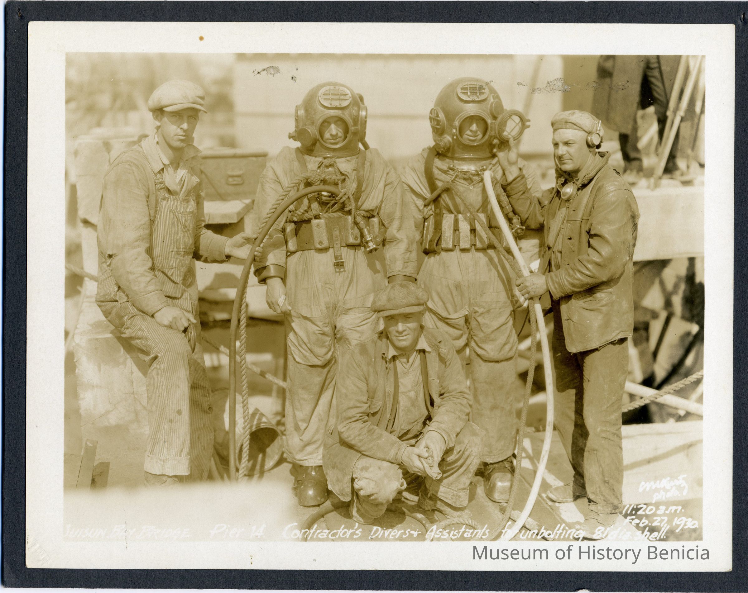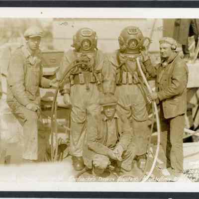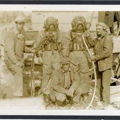 Pier 14. Contractor's Divers & Assistance for unbolting 81 dia shell. Black and white photo.