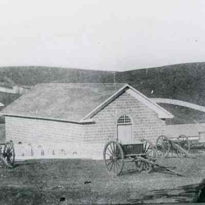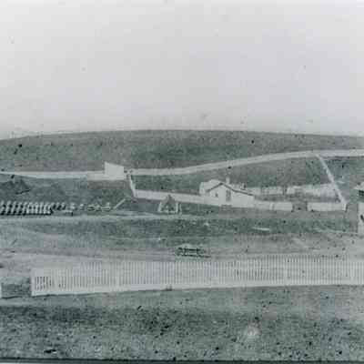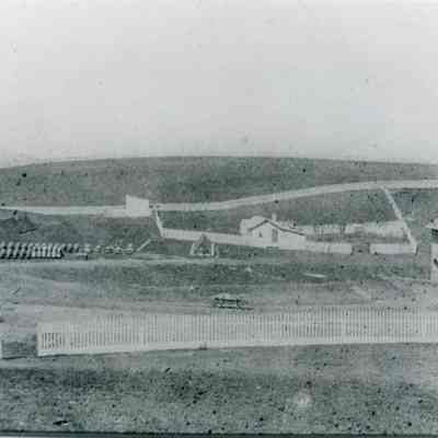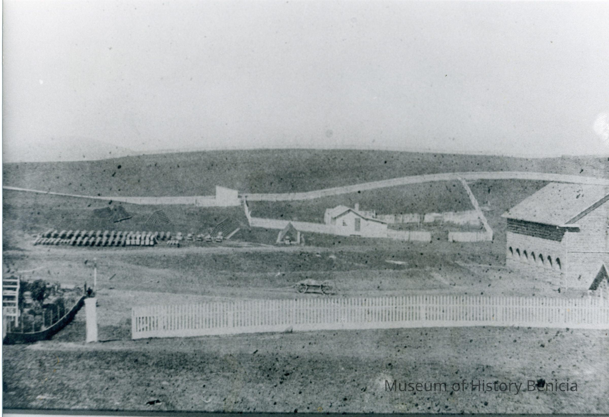 1856 view of Benicia Arsenal buildings showing Camel Barns (buildings 7,8,9), headquarters and some Benicia barracks buildings. B/W photo.