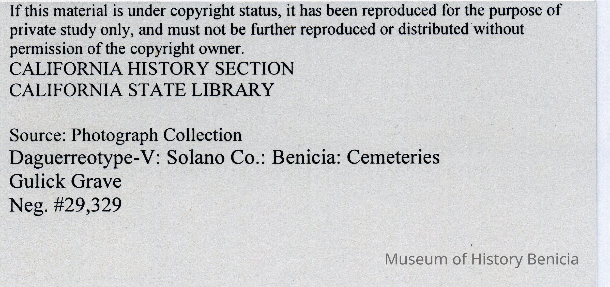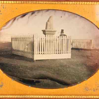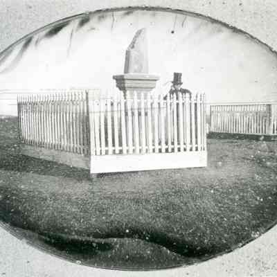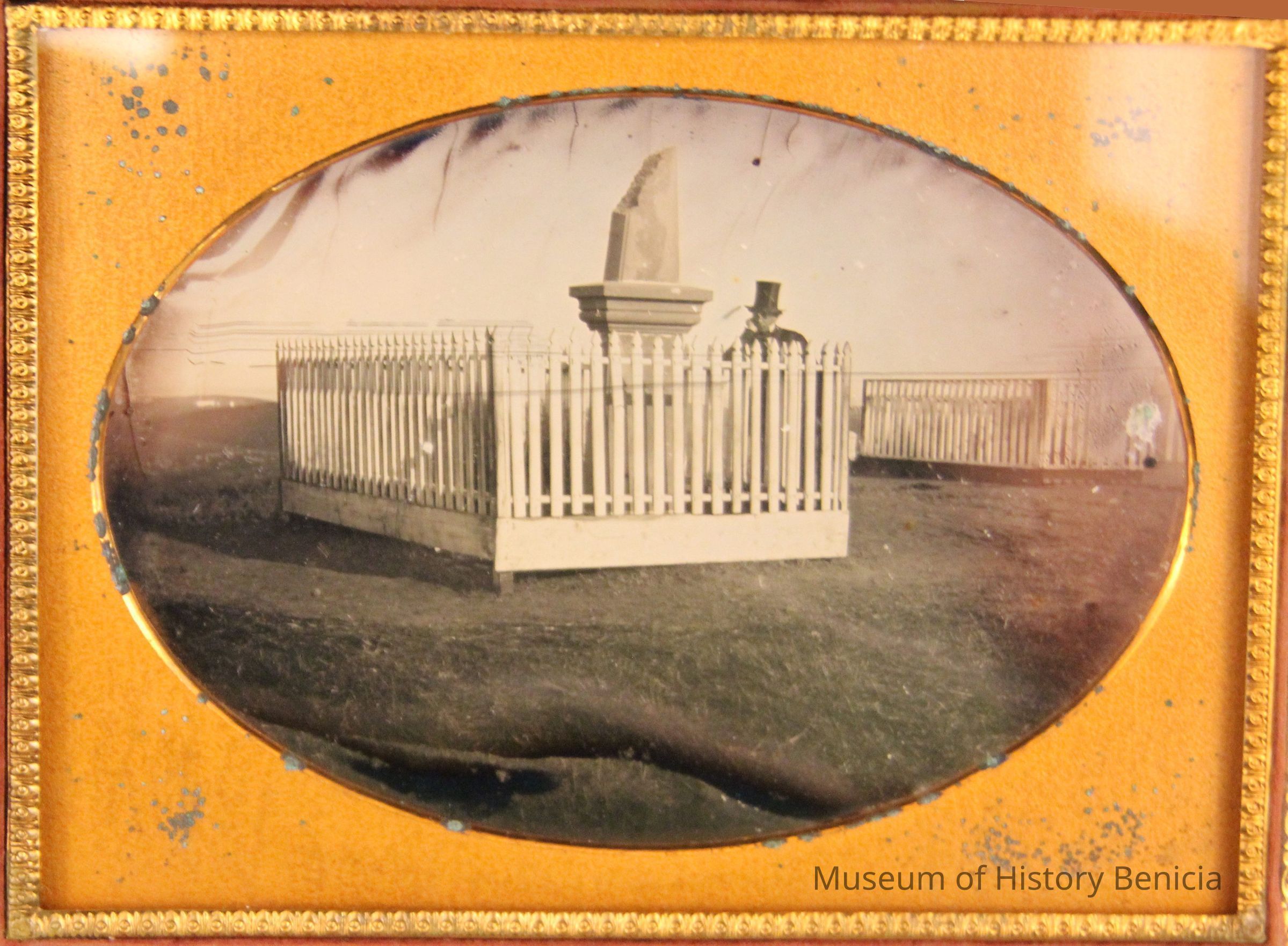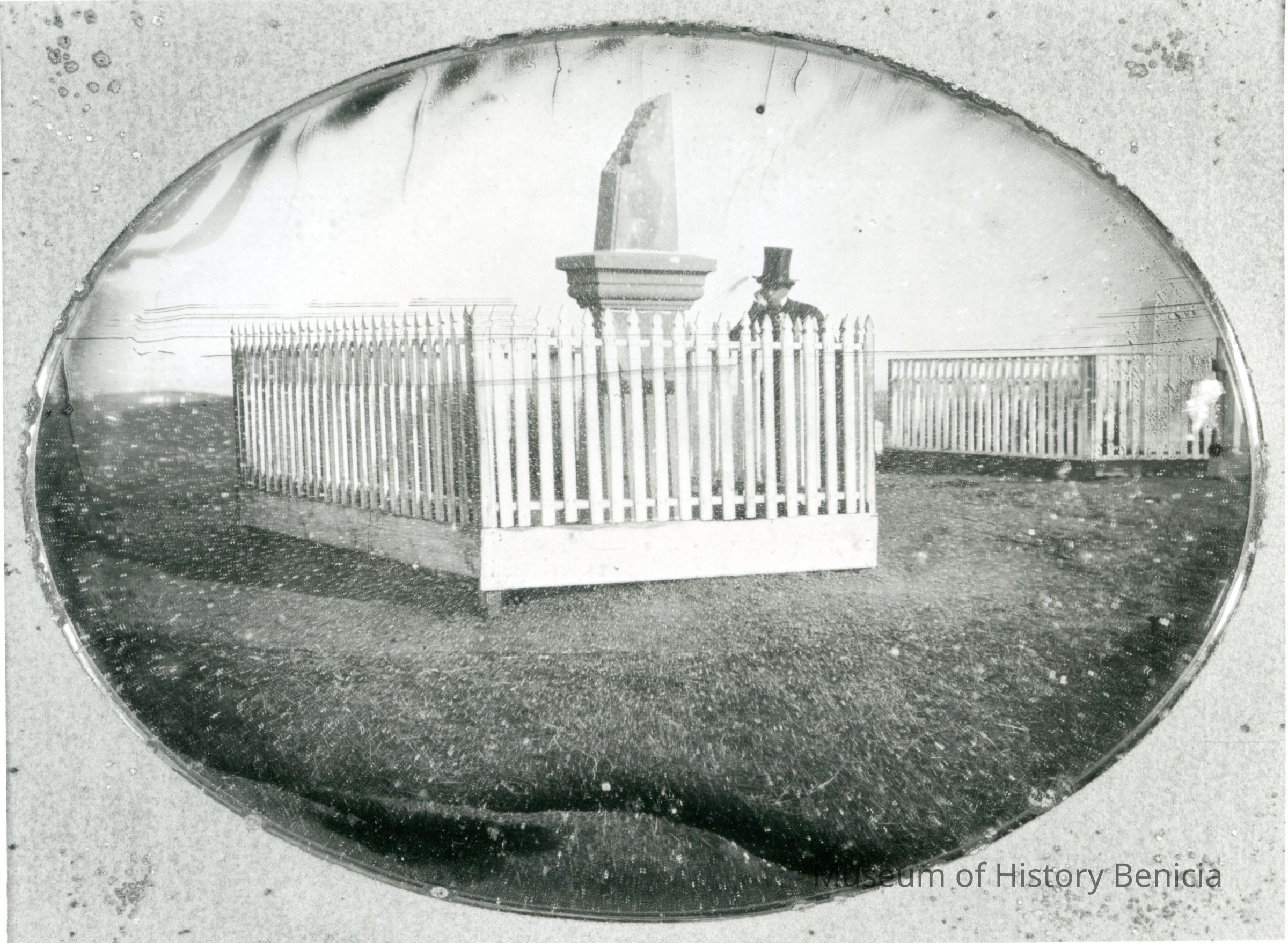 A copy of a photo from the California State Library Benicia collection. The original is a daguerreotype of one of the Gulick brothers standing next to the grave of his brother in the Benicia cemetery circa 1858. The photos were taken for the Gulick brothers who were early Benicia businessmen.