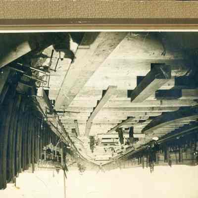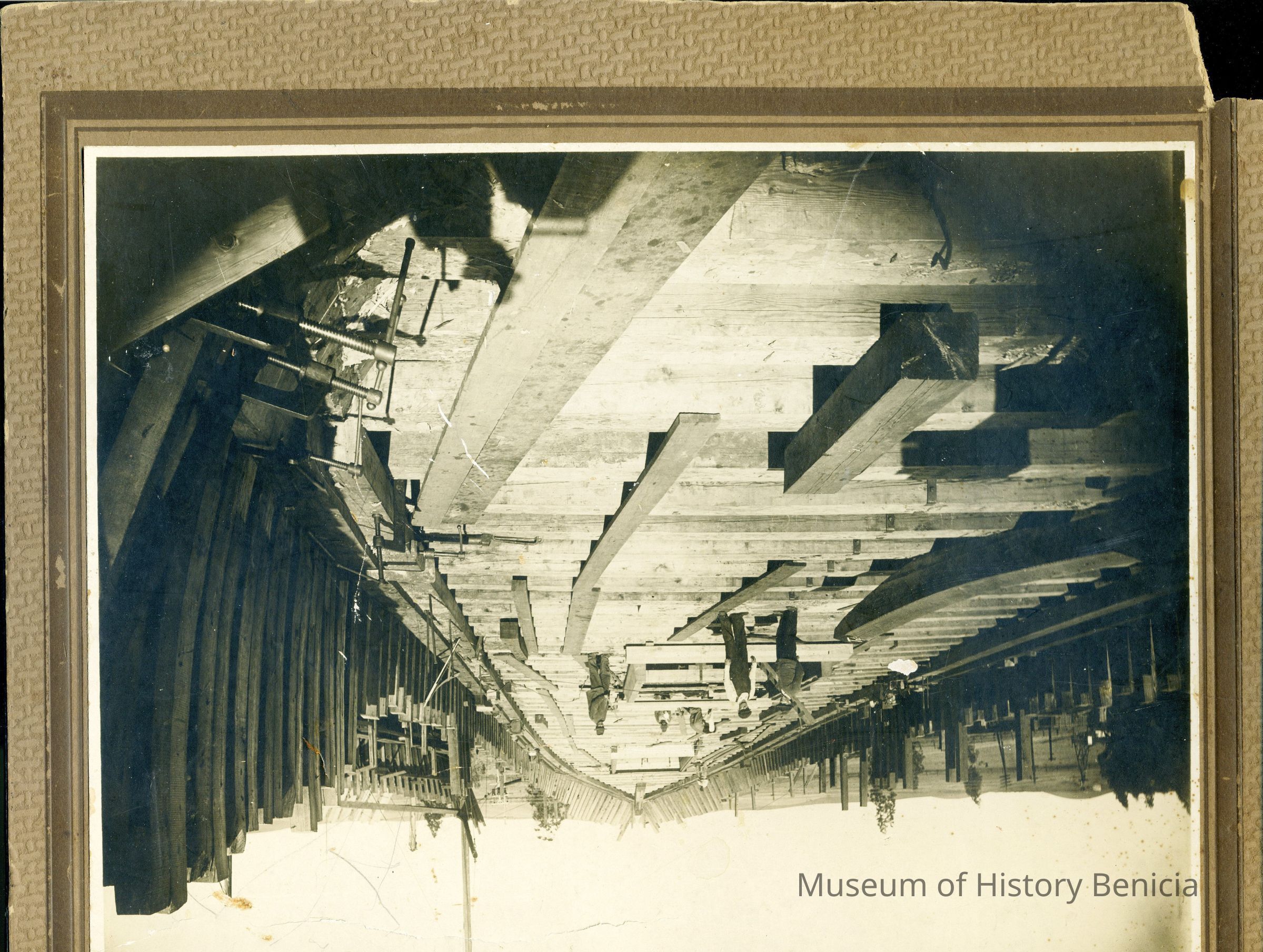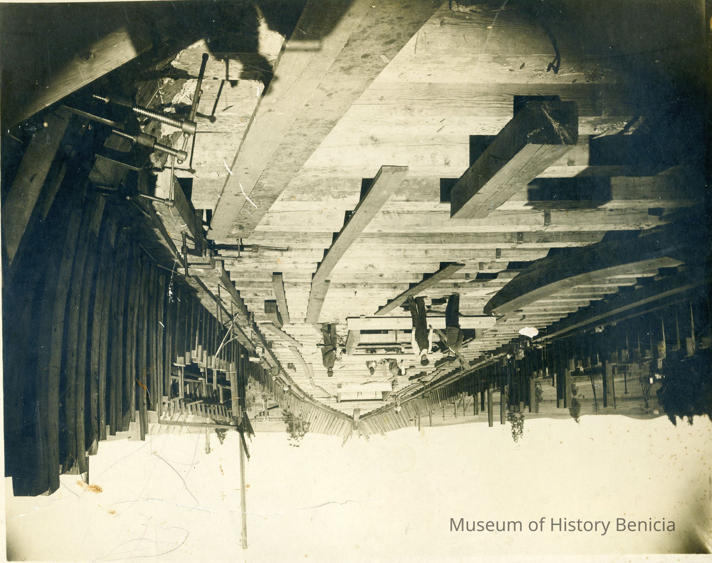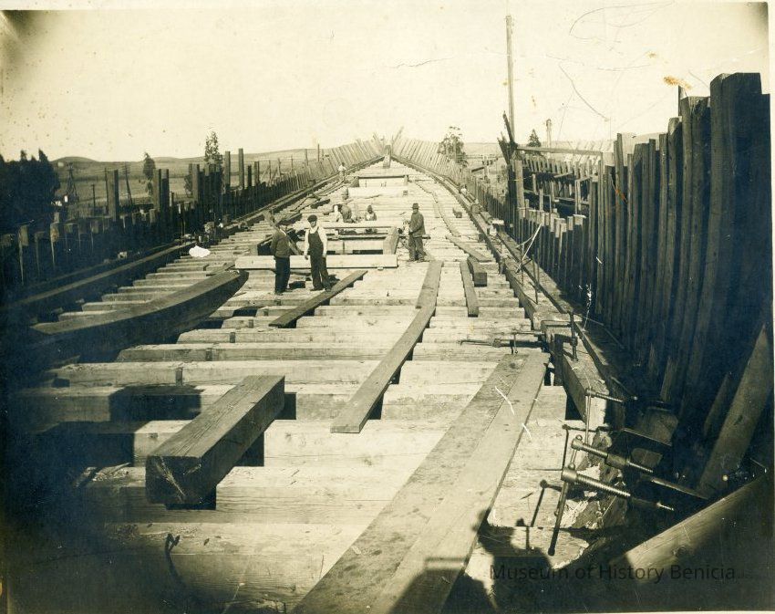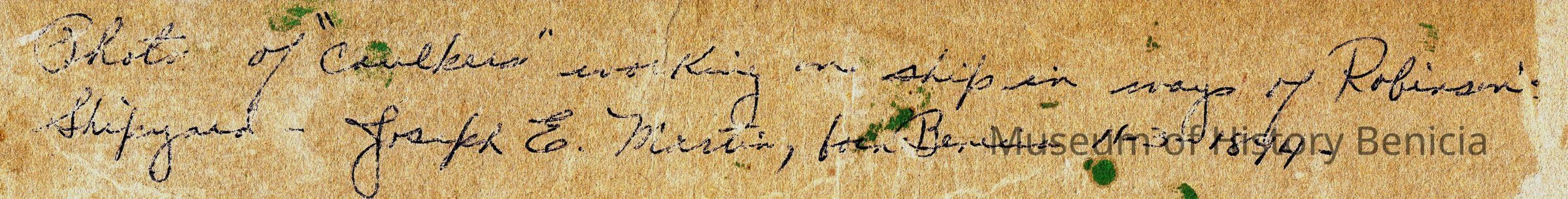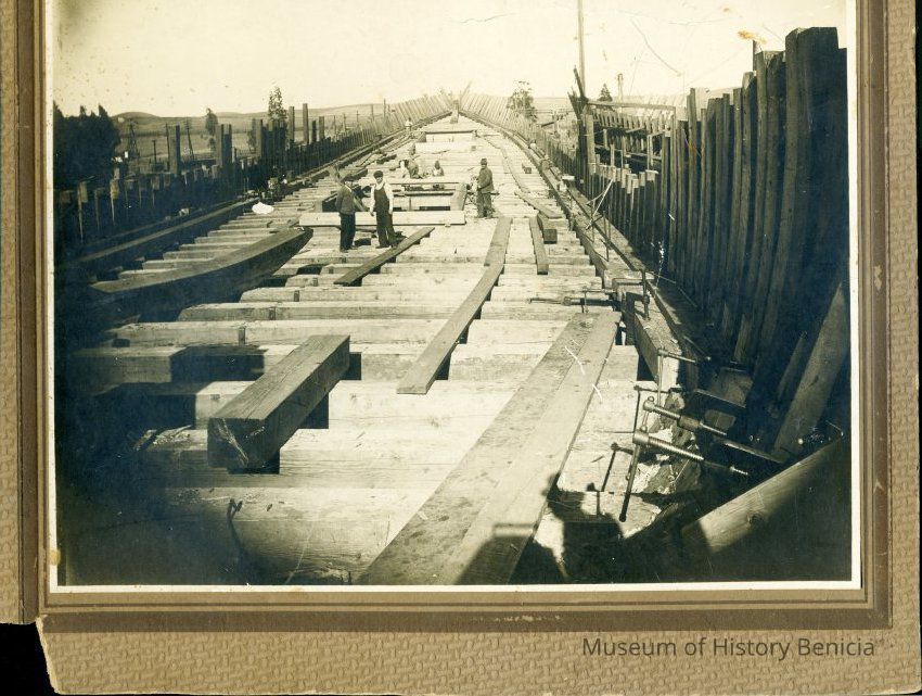 Photo of the Robinson shipyard in Benicia. Shown are "caulkers" working in the ways. On the back it mentions Joseph E Martin born 11/3/1894 in Benicia.Collection