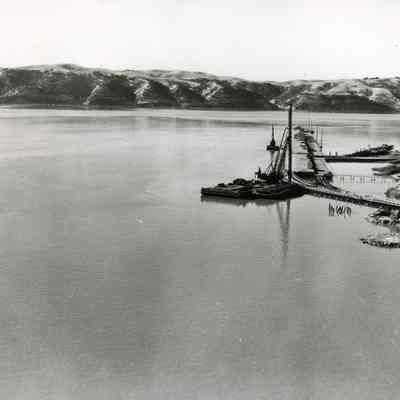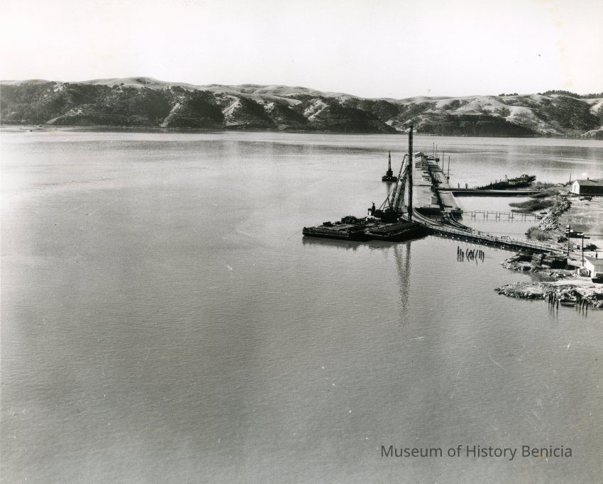 B/W aerial photo of pile driver on a barge along northern edge of Carquinez Strait, south of the Benicia/Martinez Bridge; old pier, rock shoreline, small buildings appear at the right.