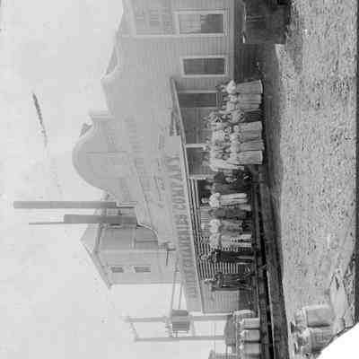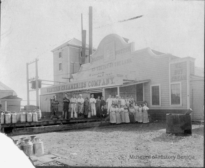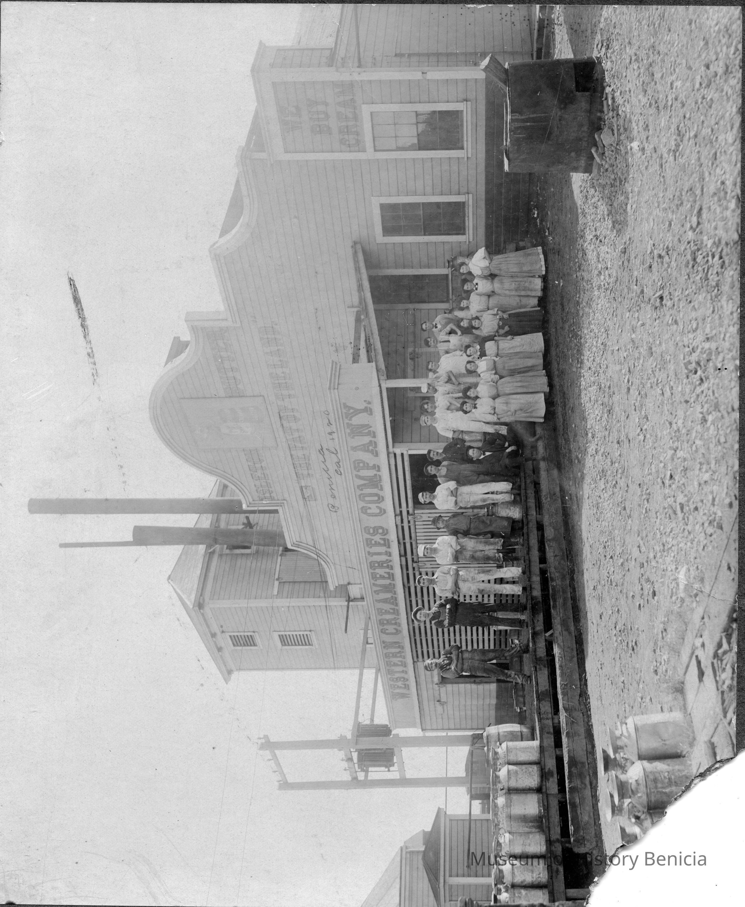 B&W photo of the men and women working at the Western Creameries in Benicia. The front of the photo has "Benicia Cal 1920". The back says "Benicia Water front bet (between) East 2nd and 1st". There is also a photographer's stamp " E A Wilder Photographer Berkeley, Cal."Collection