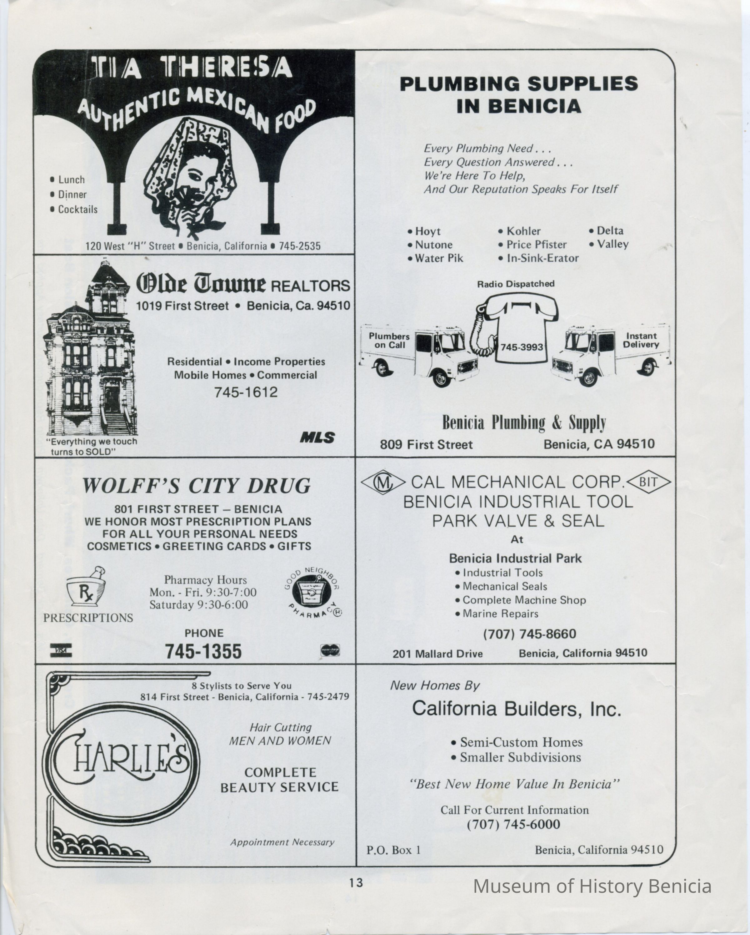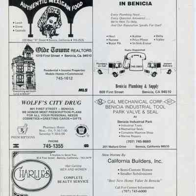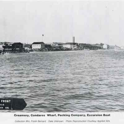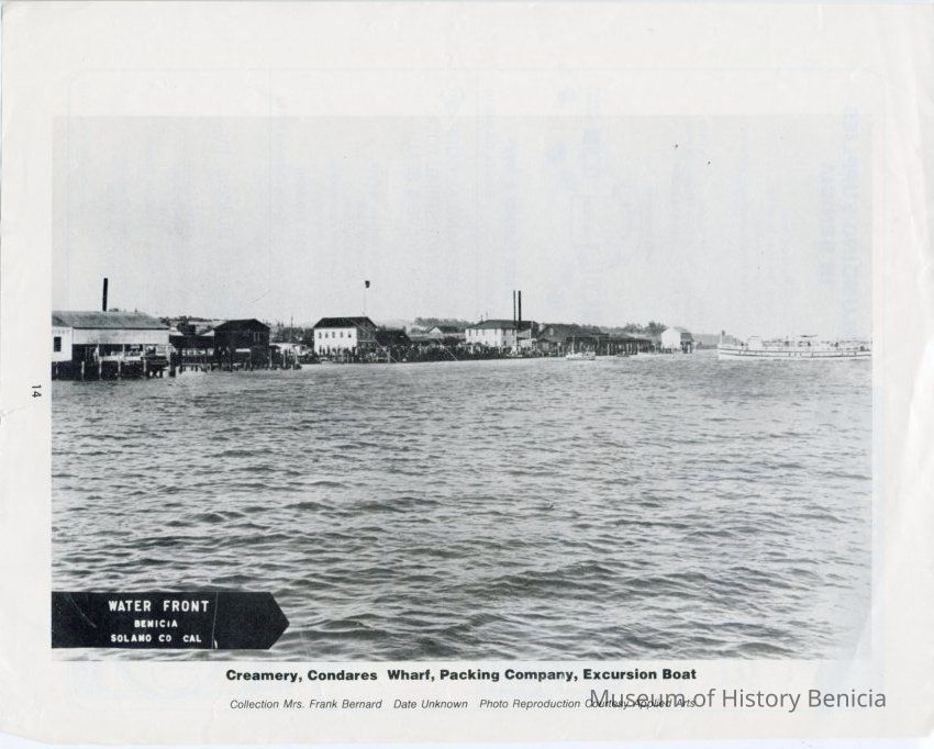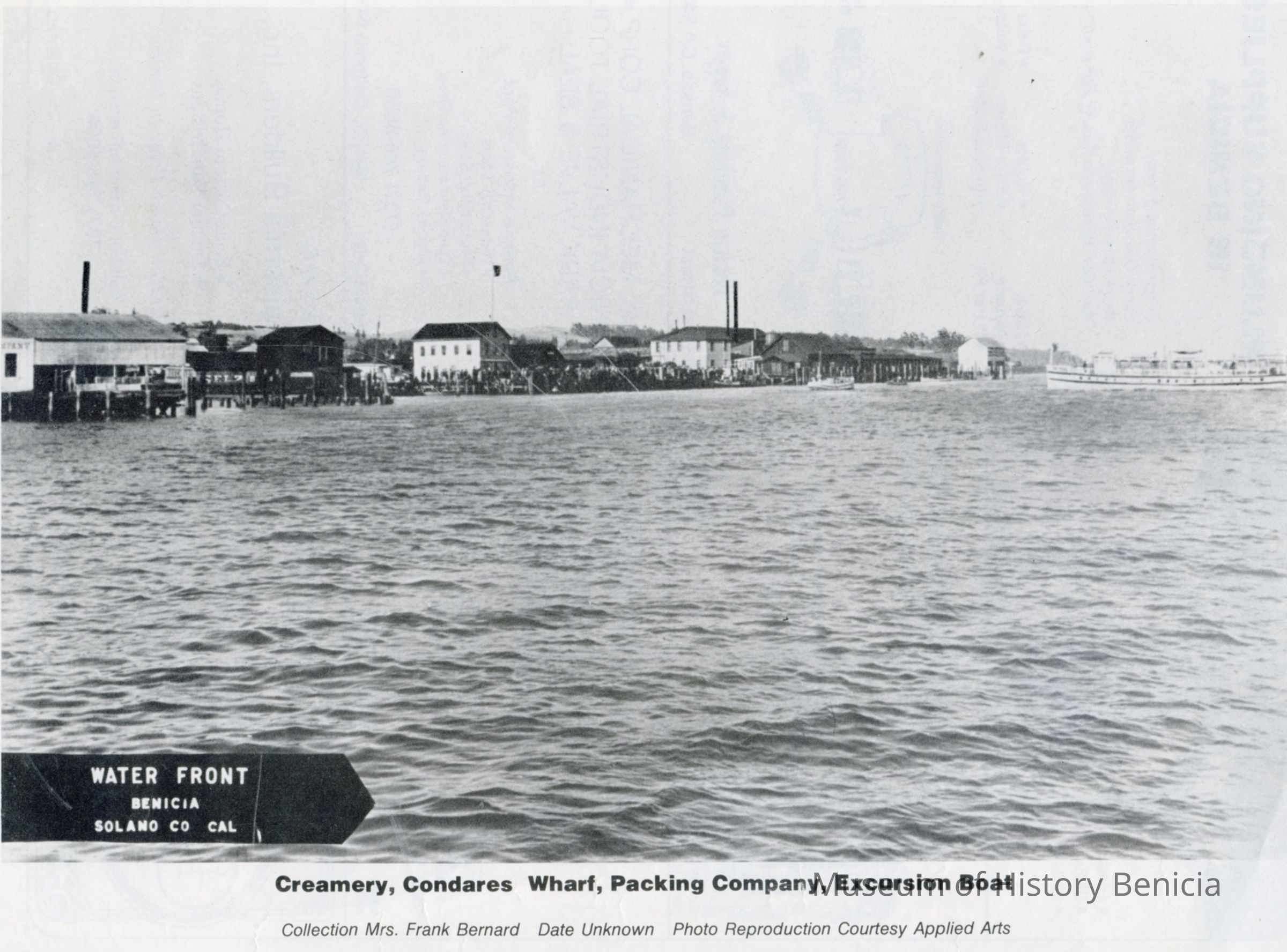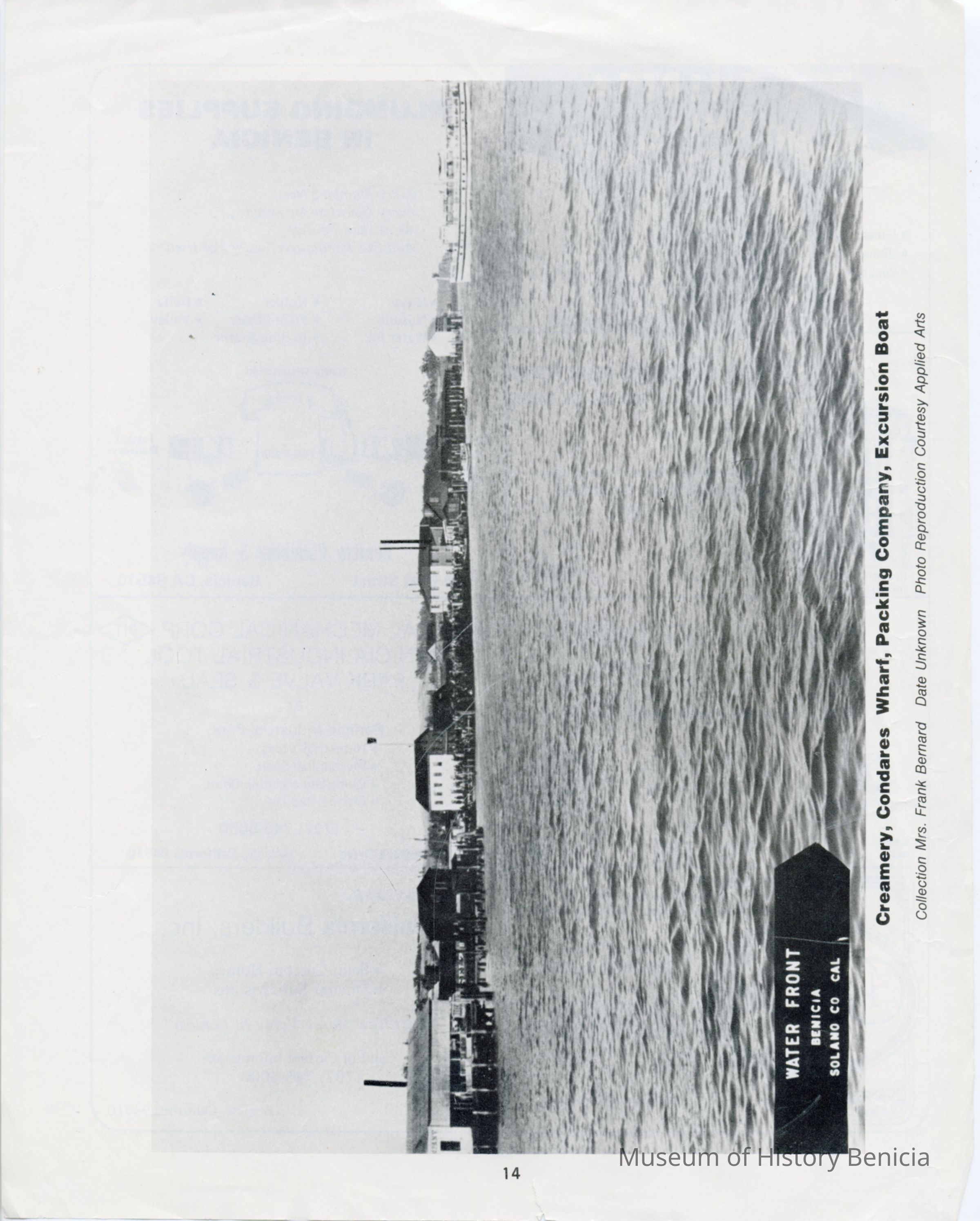 Photo of the Benicia waterfront with a boat coming in to dock. The photo is published in what looks like a program or yearbook because there are ads on the other side and that page is numbered "13". One of the ads is for Tia Theresa's which was the last business in the old Brewery building. The caption is "Creamery, Condares Wharf, Packing Company, Excursion Boat". Below that it says Collection Mrs Frank Bernard Date Unknown Photo Reproduction Courtesy Applied Arts.Collection
