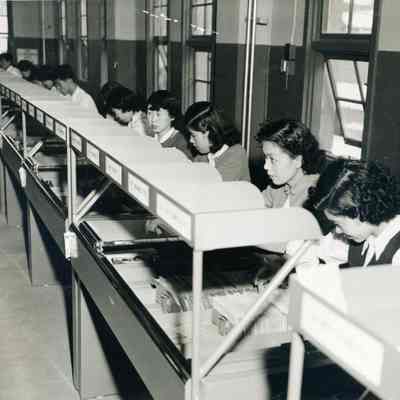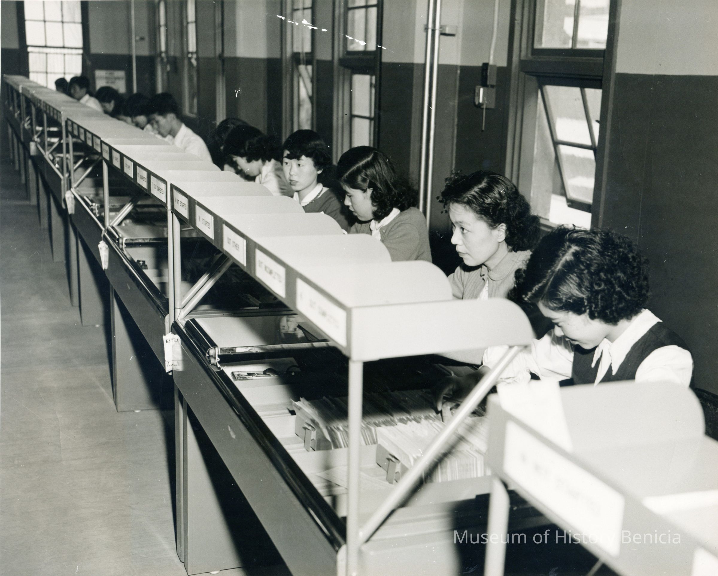 Row of Asian women filing cards in a warehouse. Stamped on back: "Japanese women are employed as editors in the availa- bility edit section of 229th Ordnance..." Women's names given: Ayako Kobayashi, Yukie ?, and Asako Kuroda, along with at least one other that is not readable.Collection