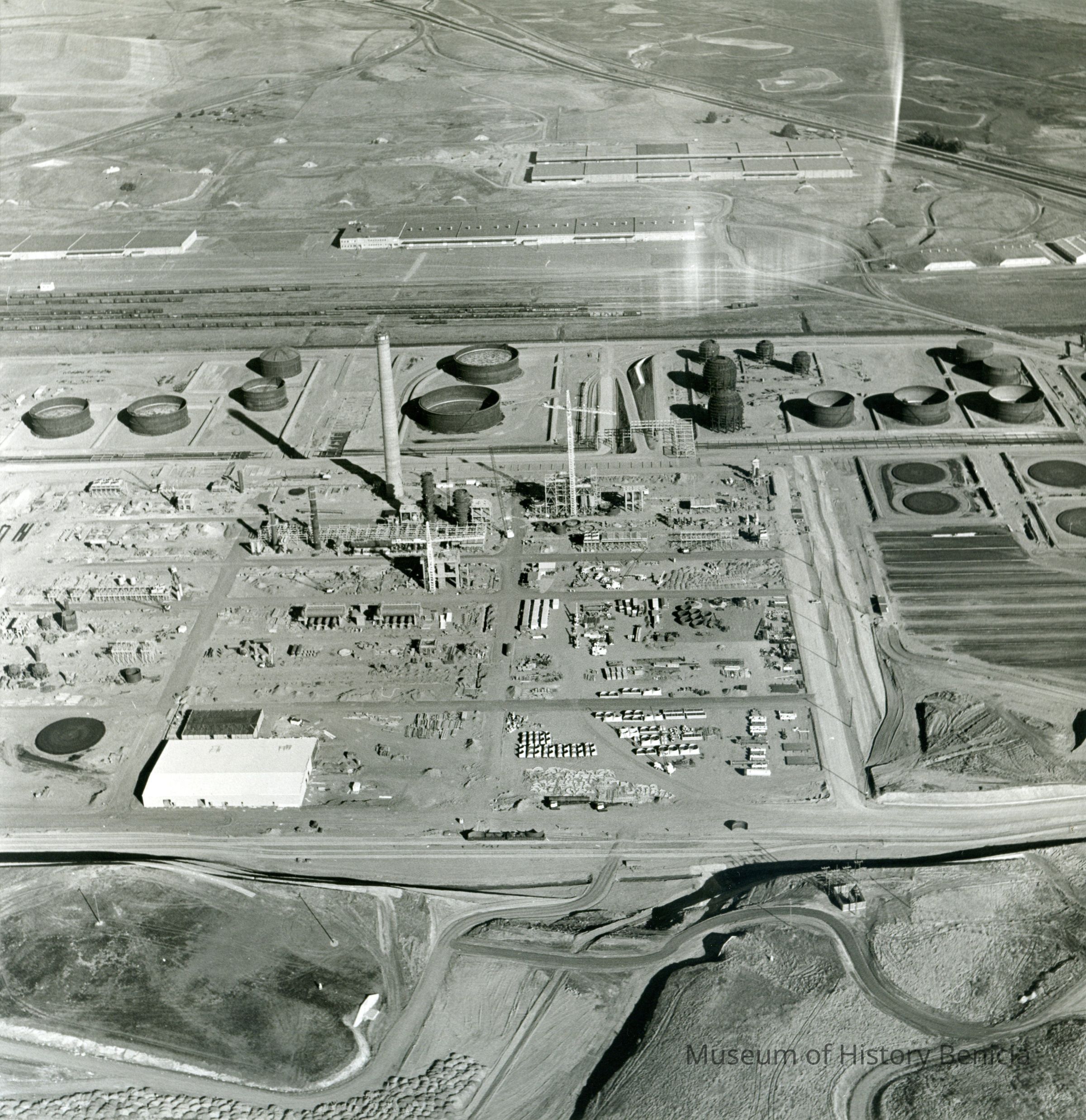 north: (steeper angle than usual); bottom to top: graded roads, layer of large rocks, in-hill bunker, access roads, buildings, vehicles, parts & materials awaiting use, refinery equipment being assembled, smoke stack and tall crane, storage tanks under construction, railroad cars on sidings, warehouses and storage buildings, Hiway 680, empty hills.Collection
