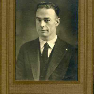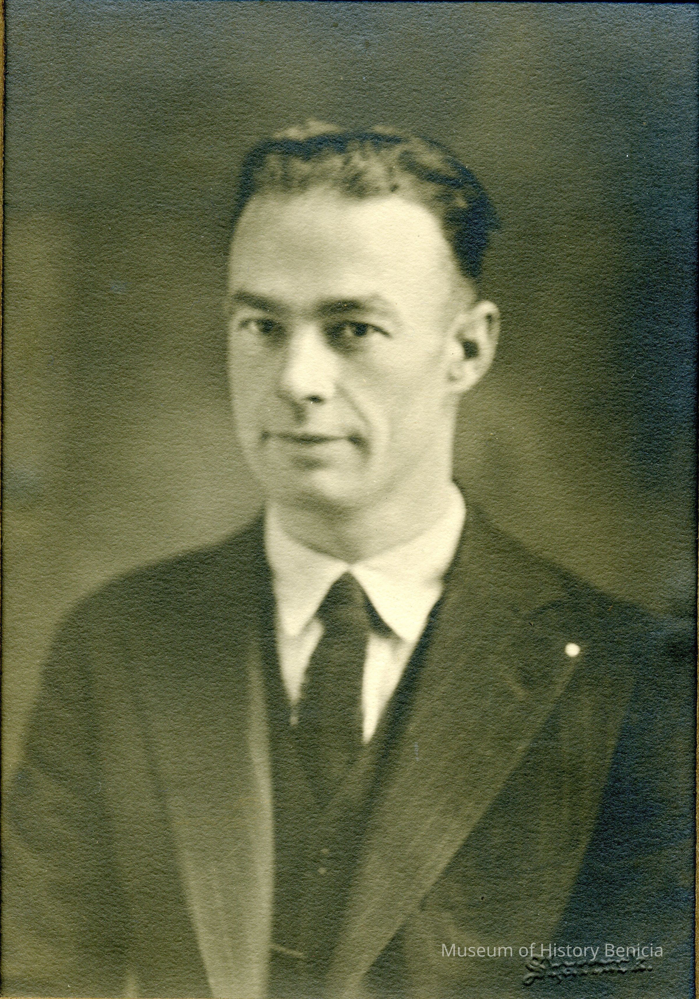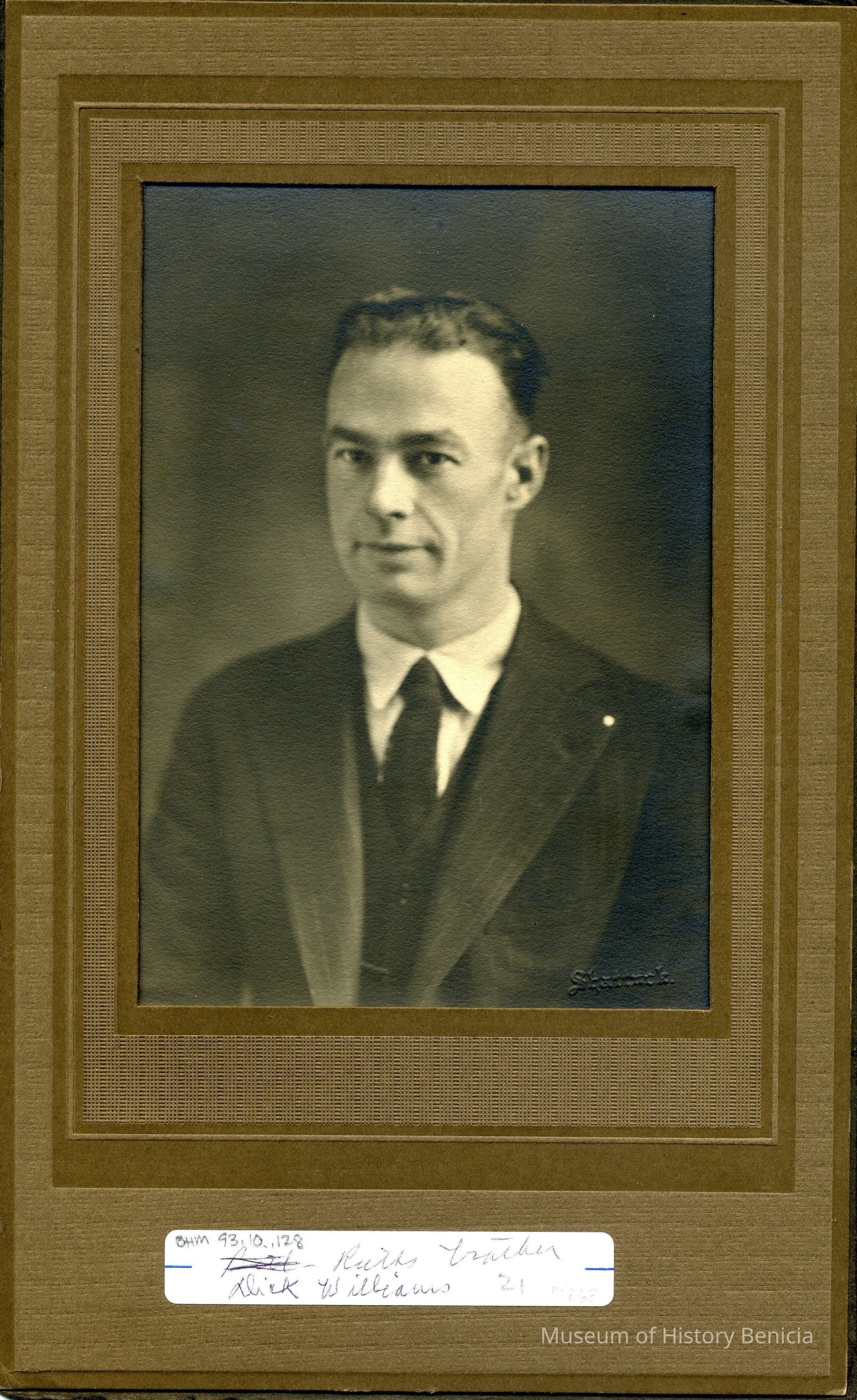 Bust view of middle-aged man (Dick Williams) in dark striped suit and tie. Black and white photo.