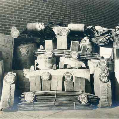 This is a photograph of bundles of leather products. Each one has a sticker on it saying;