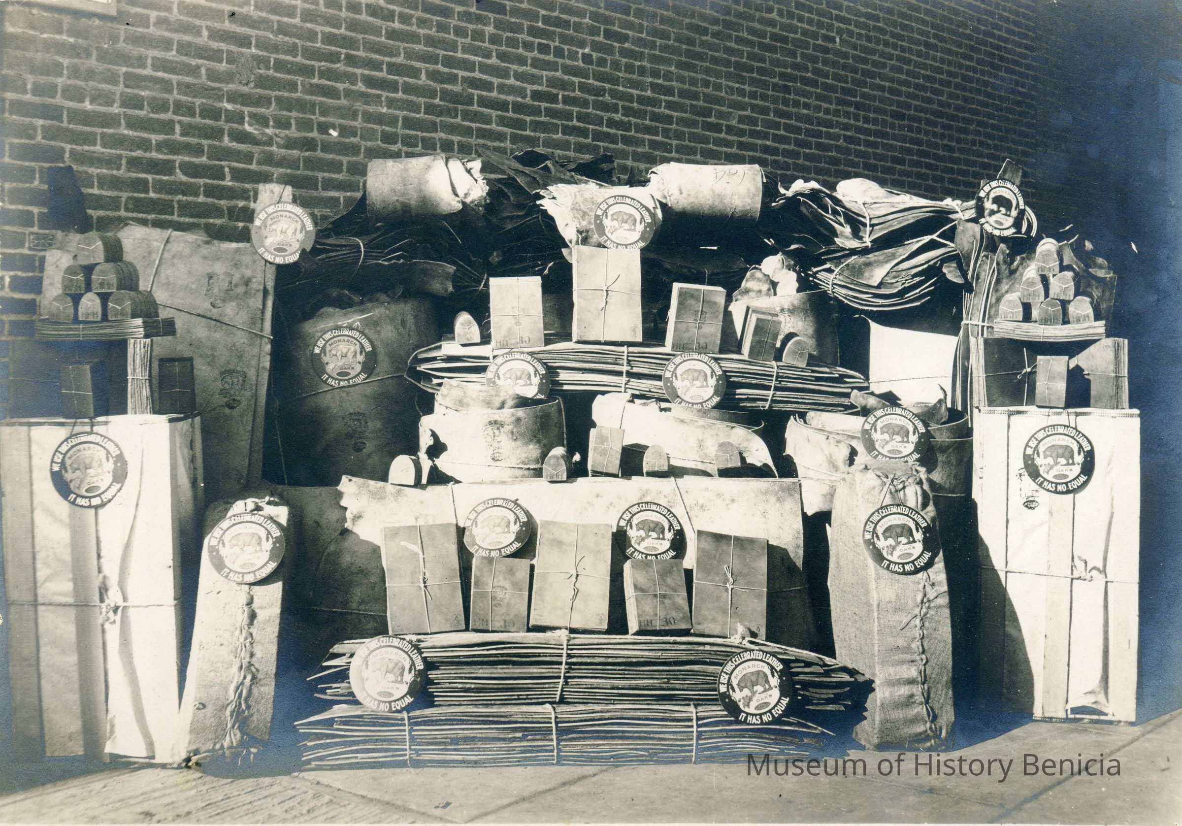 "We use this celebrated leather / It has no equal". The center of the sticker shows a bear and the words "Monarch Oaks". This was the symbol of the Kullman-Salz tannery in Benicia.Collection